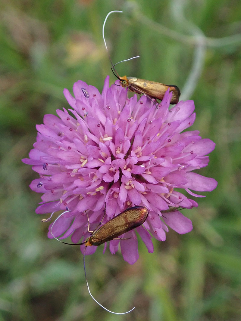 L'adèle de la scabieuse a les ailes couleur bronze doré et, comme les autres adelidae, elle a des antennes très longues, mais elles sont de couleur blanche sur les deux tiers externes. On note aussi la présence d'une touffe de poils orange sur la tête. Ses yeux sont verts.