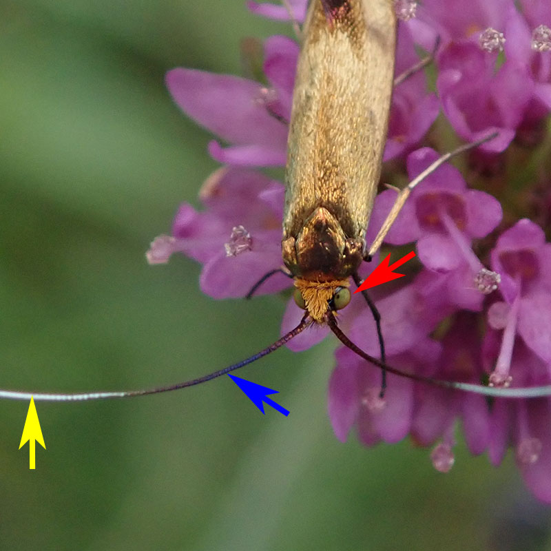 Dimorphisme sexuel Le mâle a des yeux plus gros et ses antennes sont plus longues : 2,5 fois la longueur des ailes, celles de la femelle ne mesure que 1,5 fois la longueur du corps.