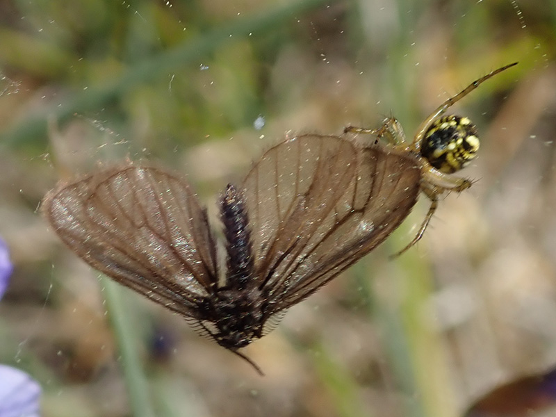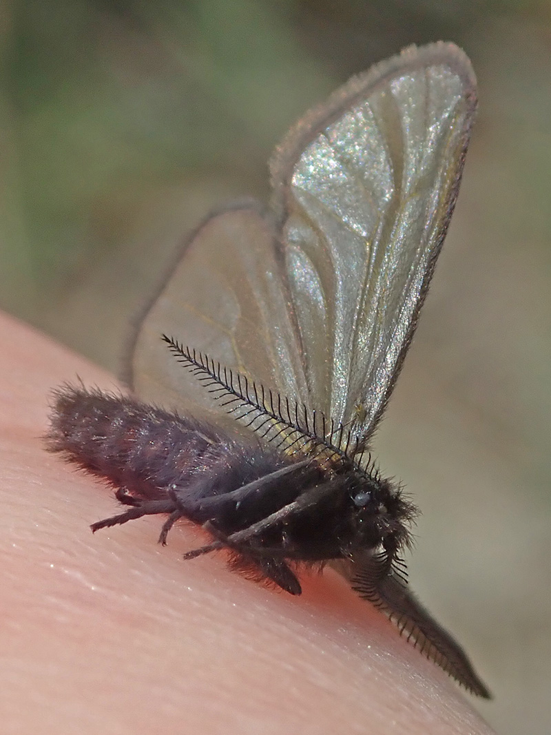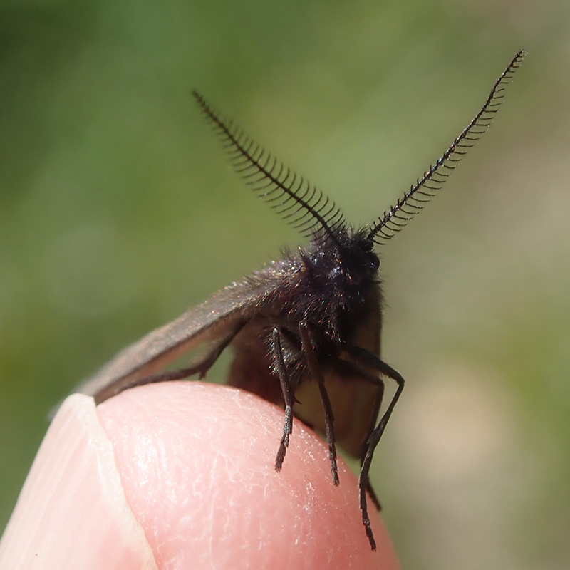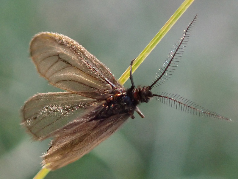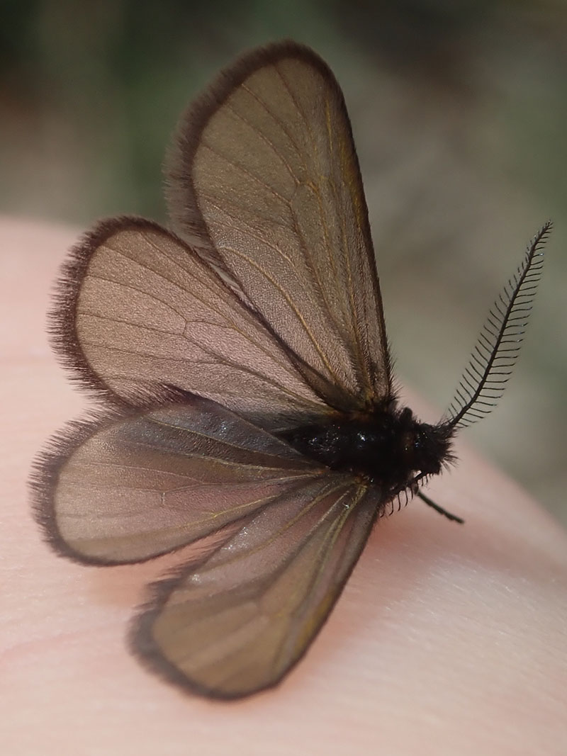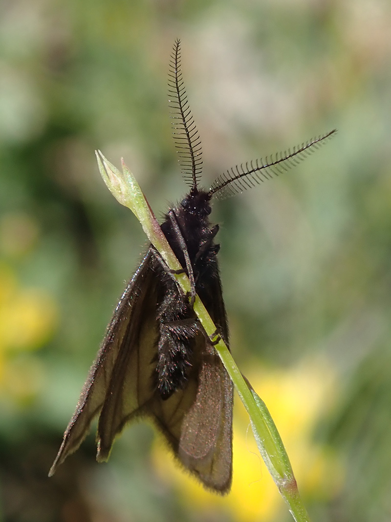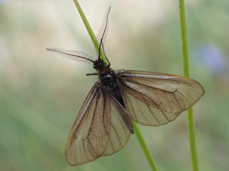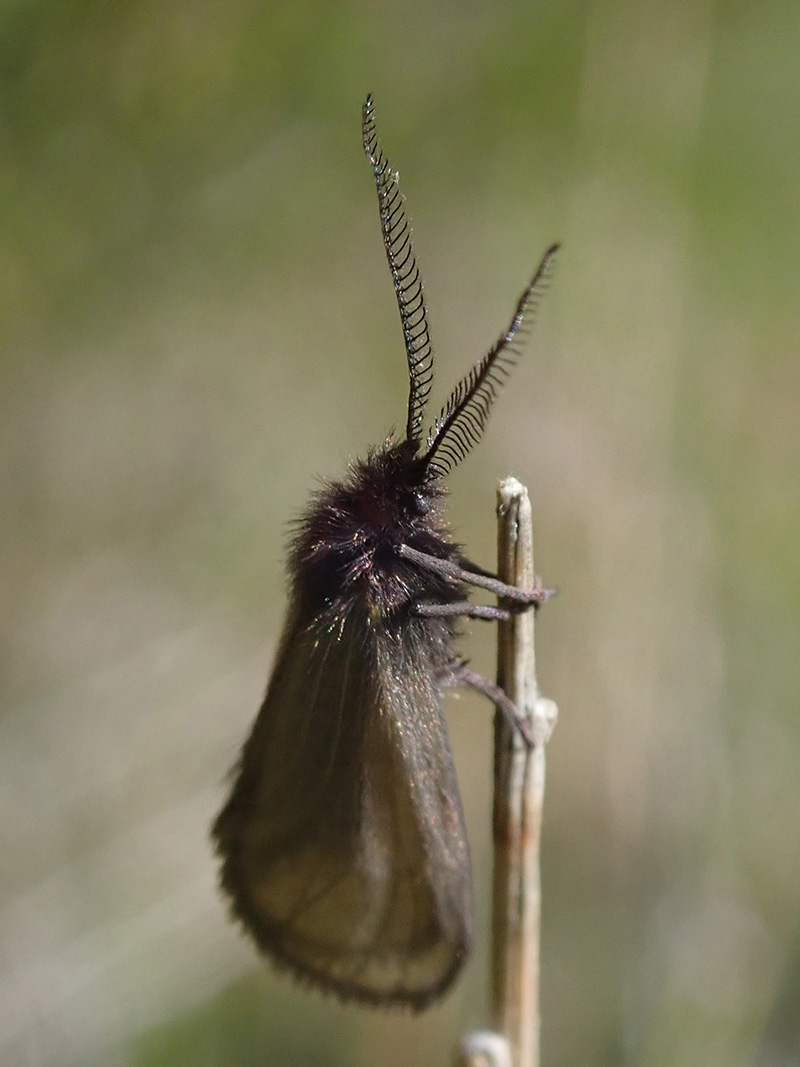 L'Hétérogynide plumeuse mâle (car la femelle est aptère et ne sort de la chrysalide que pour l'accouplement) est un papillon aux ailes brun-noir et aux antennes pectinées (pour le mâle). L'ensemble du corps est fuligineux et velu. Son vol est peu rapide et sur de courtes distances, mais il est cependant assez farouche et difficile à photographier. Les femelles pondent leurs oeufs à l'intérieur d'un cocon tissé assez haut dans la végétation. Les jeunes chenilles vivent à l'intérieur.