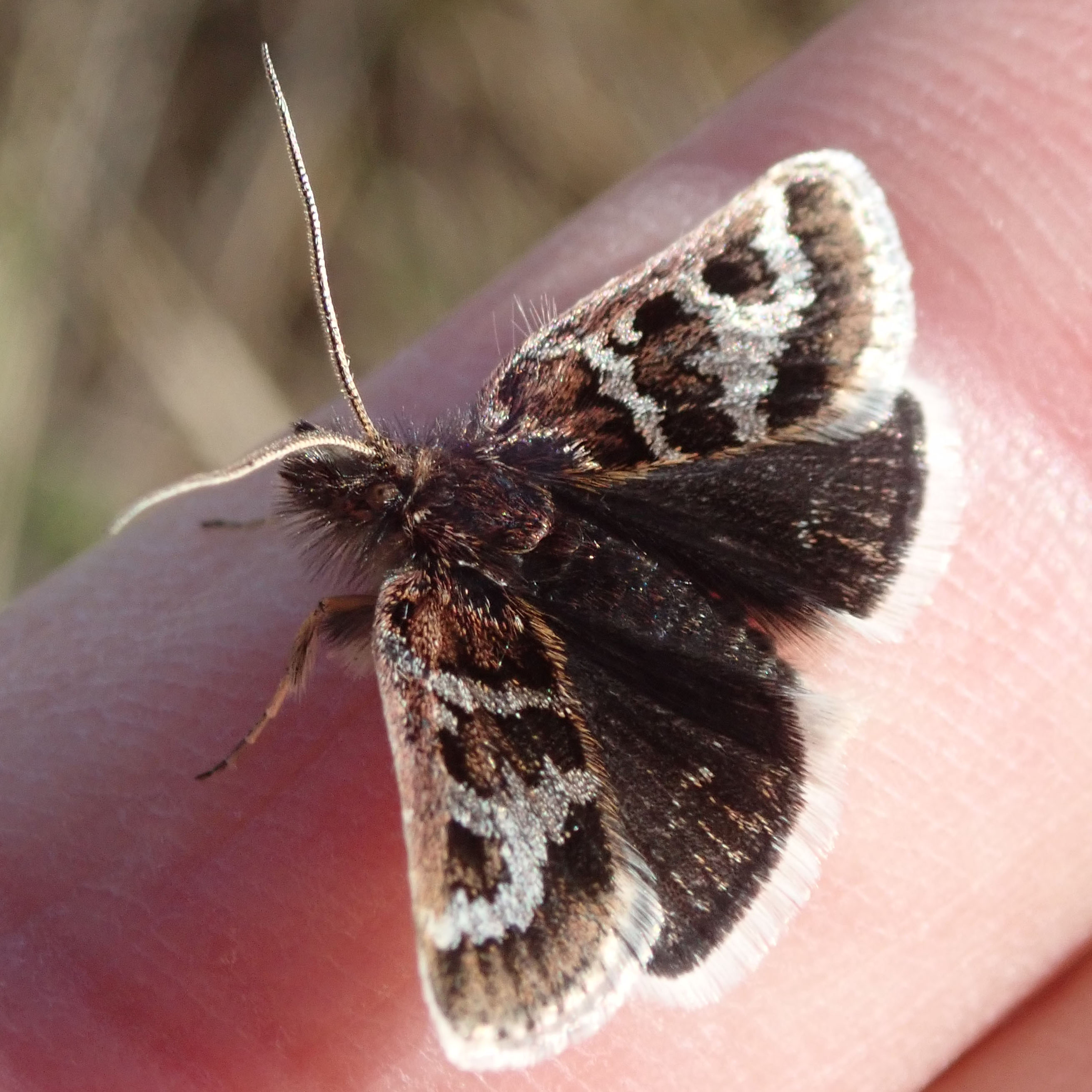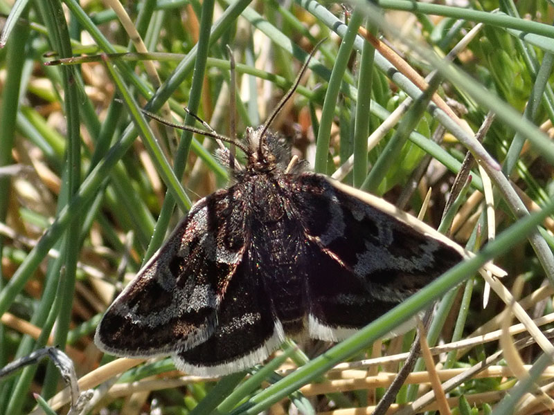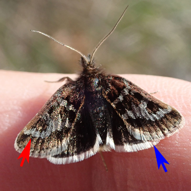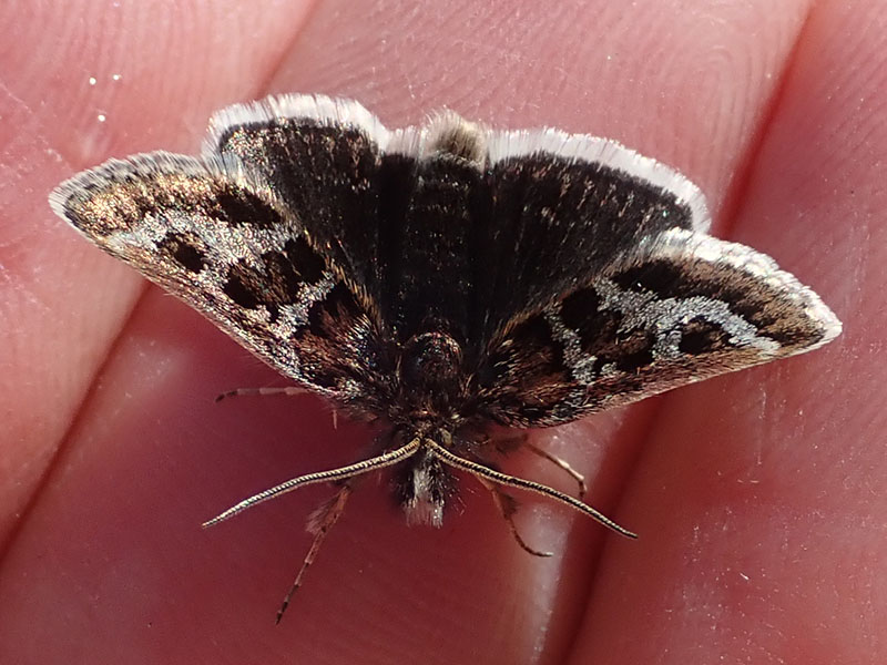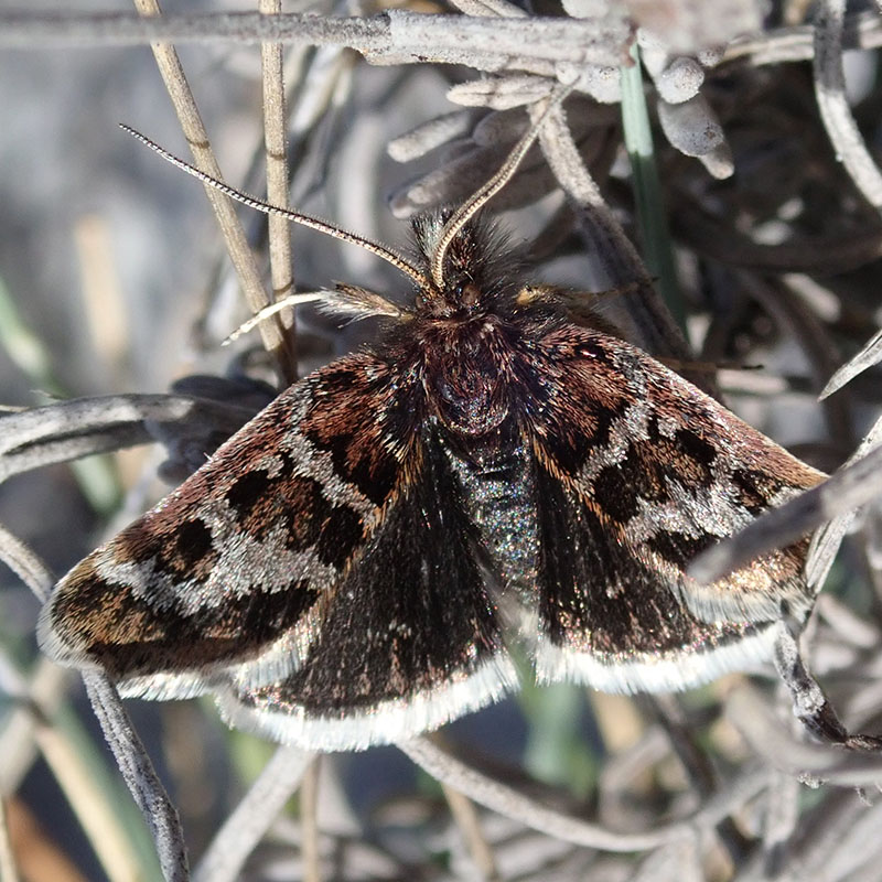 Ce petit papillon très actif se rencontre toujours en montagne et surtout à l'étage alpin. C'est un papillon d'altitude qui a un vol très rapide et rasant... il est doté d'une excellente vue, détecte tout mouvement et se cache dans l'entremêlement des herbes et des rameaux des arbrisseaux : difficile à approcher et à photographier compte tenu de sa petite taille ! Le fond du desssus des ailes antérieures est brun foncé avec des reflets mordorés, orné de bandes transversales gris clair. La plus externe de ces bandes formant un angle de 90° avec la côte. Le fond du dessus des ailes postérieures est presque noir avec une bande gris clair plus ou moins visible. Le revers des ailes est difficilement observable sans capture, cependant les ailes avant semblent être ornées de taches blanches allongées entre les nervures.