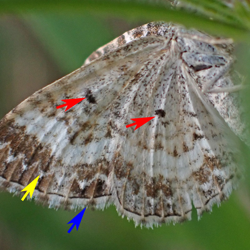 ... décorée par une ligne brisée blanche (flèche jaune), avec une frange blanche marquée de taches brunes (flèche bleue) et avec deux taches brun foncé dans la cellule (flèches rouges)