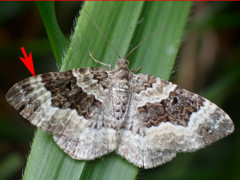 Dessus des ailes traversé par une ligne brun foncé épaisse suivi par une bande blanche plus fine et divisée en deux parties par une étroite ligne grise