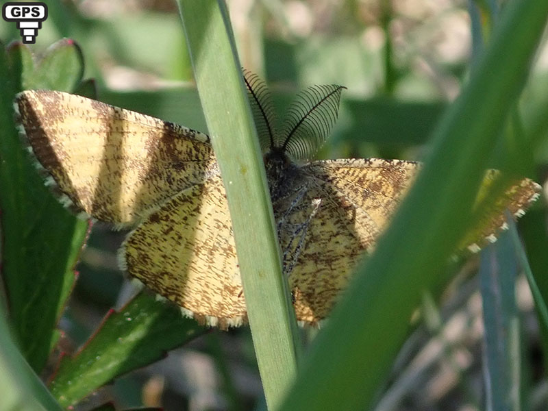 Dimorphisme sexuel Le mâle est jaune avec des bandes et des tirets transversaux bruns, il a les antennes pectinées. La femelle est blanc-jaunâtre avec des bandes brun-noir et les antennes filiformes.
