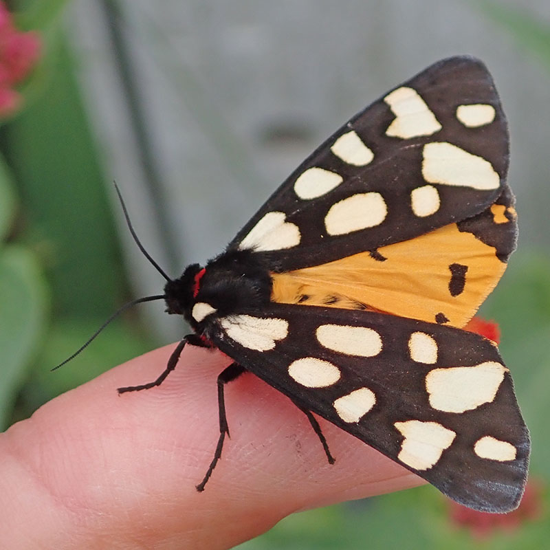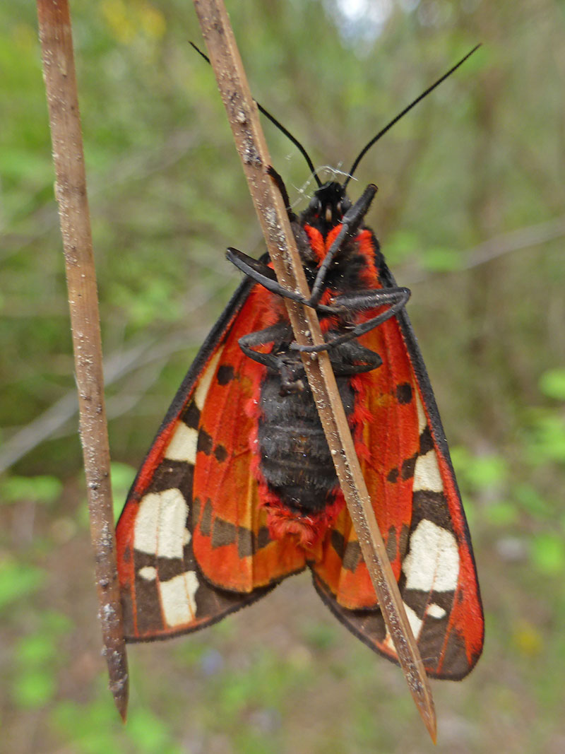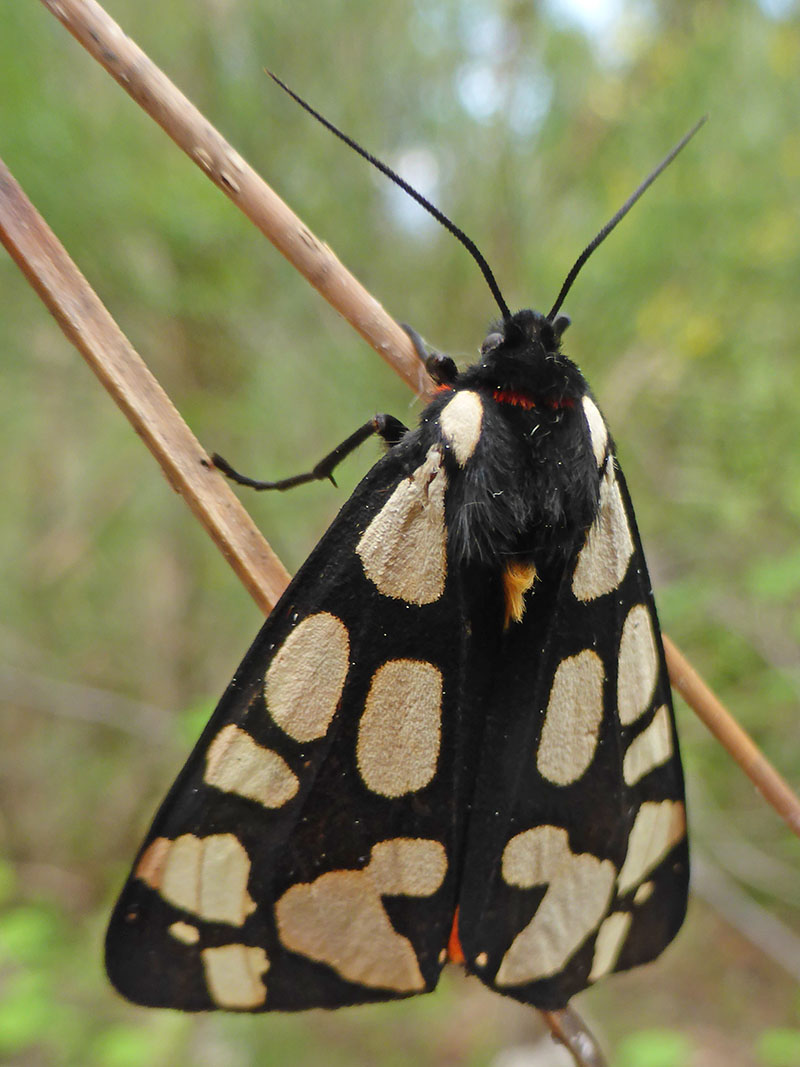 Espèce nocturne, l'écaille fermière peut voler de jour quand il fait chaud (surtout le mâle). C'est une espèce polymorphe : l'emplacement et la taille des taches peut beaucoup varier. Les antérieures sont noires avec des taches blanc-crême, les postérieures sont rouge-orangé et marquées de taches noires. Malgré ce polymorphisme, c'est un papillon facile à identifier. La chenille peut être visible dès le mois de février ; elle est noire, couverte de longs poils raides et sa tête est rouge-orangé ainsi que les 6 pattes ambulatoires et les fausses pattes.