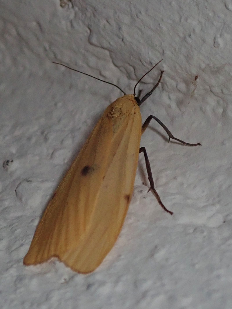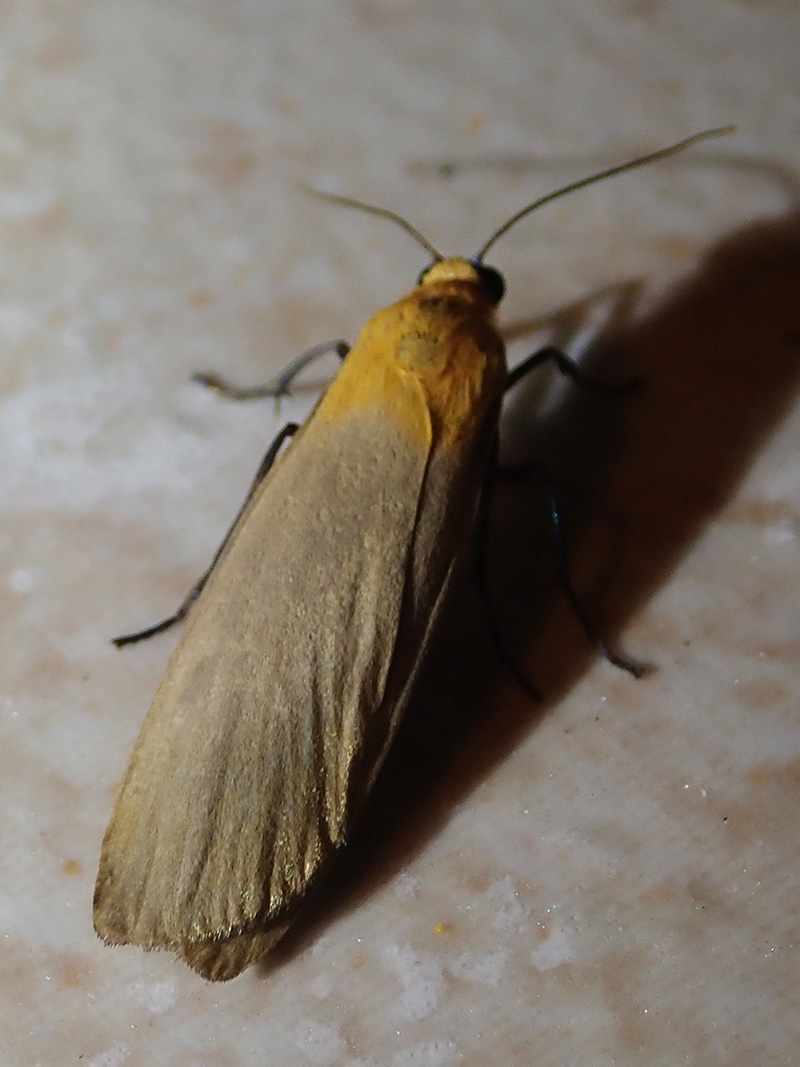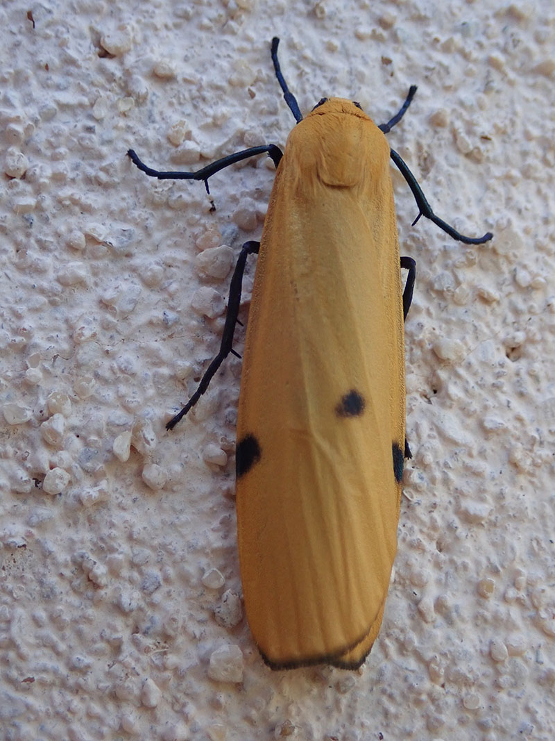 La lithosie quadrille est la plus grande des lithosies, c'est un papillon essentiellement nocturne mais on peut parfois le voir voler en fin de journée ou le retrouver le jour, posé sur les murs où il ne passe pas inaperçu compte tenu de sa taille et de sa couleur. Au repos, il replie ses ailes l'une sur l'autre et offre l'aspect d'un insecte tout en longueur. Le dessus des ailes antérieures est uniformément jaune chez la femelle avec deux points noirs au milieu de l'aile (l'un sur la côte, l'autre sur le bord interne), celui du mâle est uniformément gris-clair. Pour leur part, les ailes postérieures sont jaunes chez les deux sexes. La chenille hiverne au premier stade et atteint sa maturité en juin. Pour plus de détail cliquez ici.