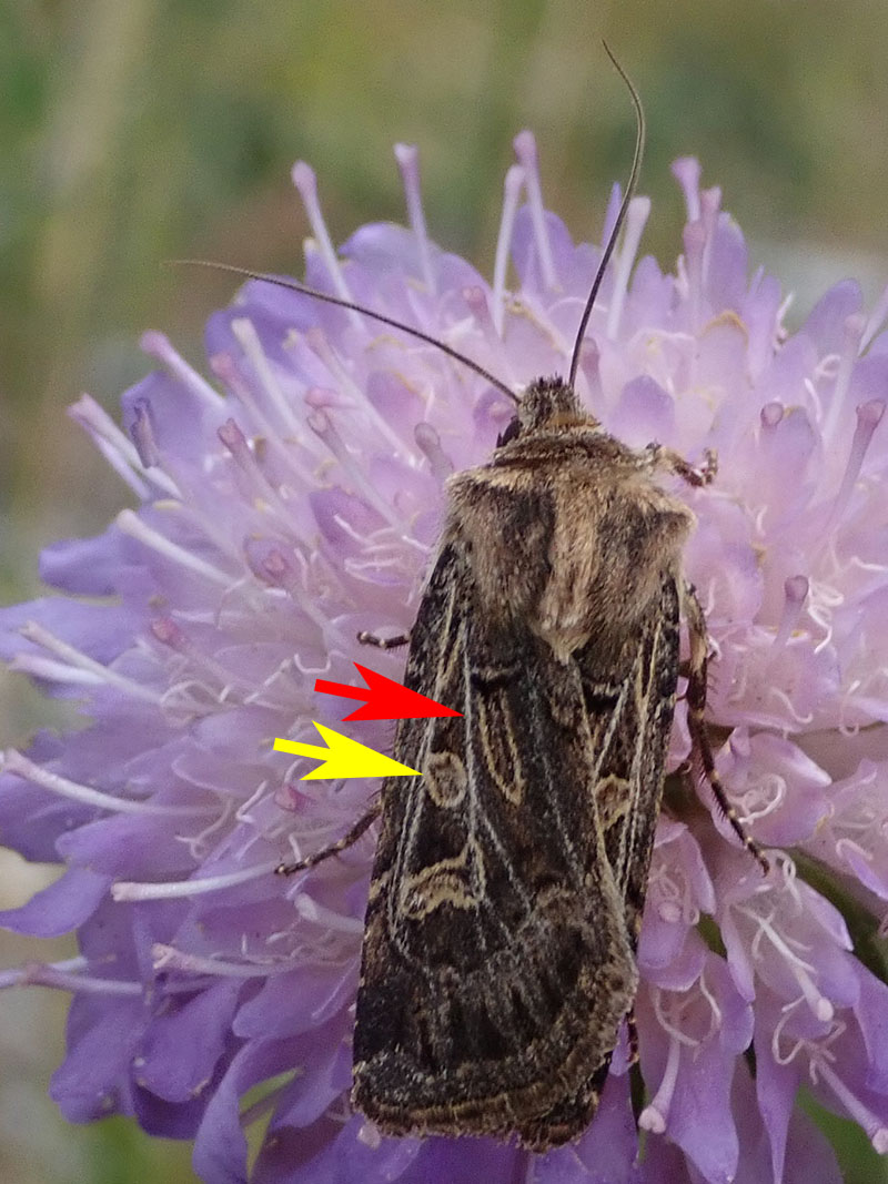L'agrotide de Larche est très rare, le dessus de ses ailes antérieures est beige avec des dessins peu contrastés. La tache dans l'aire postmédiane est en forme de quartier de Lune et non en forme de rein.