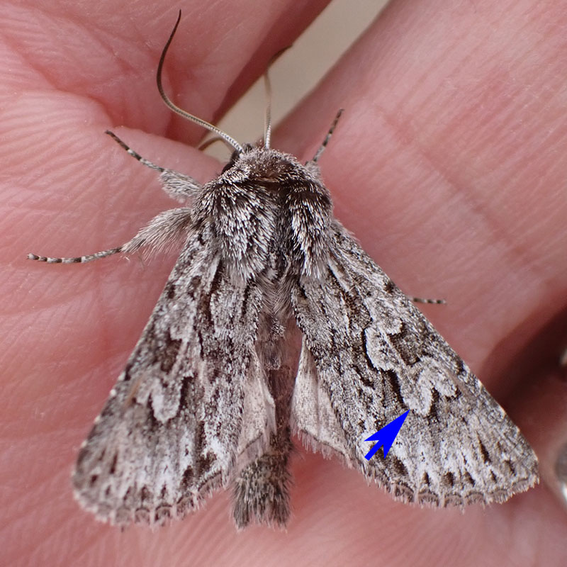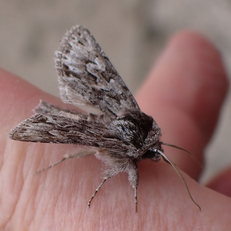 La Noctuelle aréolée est un des rares papillons visible l'hiver. Il a les ailes antérieures grises marbrées de gris foncé. Dans la zone médiane des ailes antérieures, elle présente un motif caractéristique ressemblant à des pétales de fleurs (voir photo avec flèche bleue). La bande submarginale des ailes antérieures est parsemée de petits traits gris foncé. Les ailes postérieures sont blanchâtre avec des nervures plus foncées. Le revers des ailes est plus uniforme : les ailes postérieures sont plus claires avec une ligne plus sombre parallèle au bord de l'aile. La Noctuelle aréolée hiverne dans le sol sous forme de chrysalide.