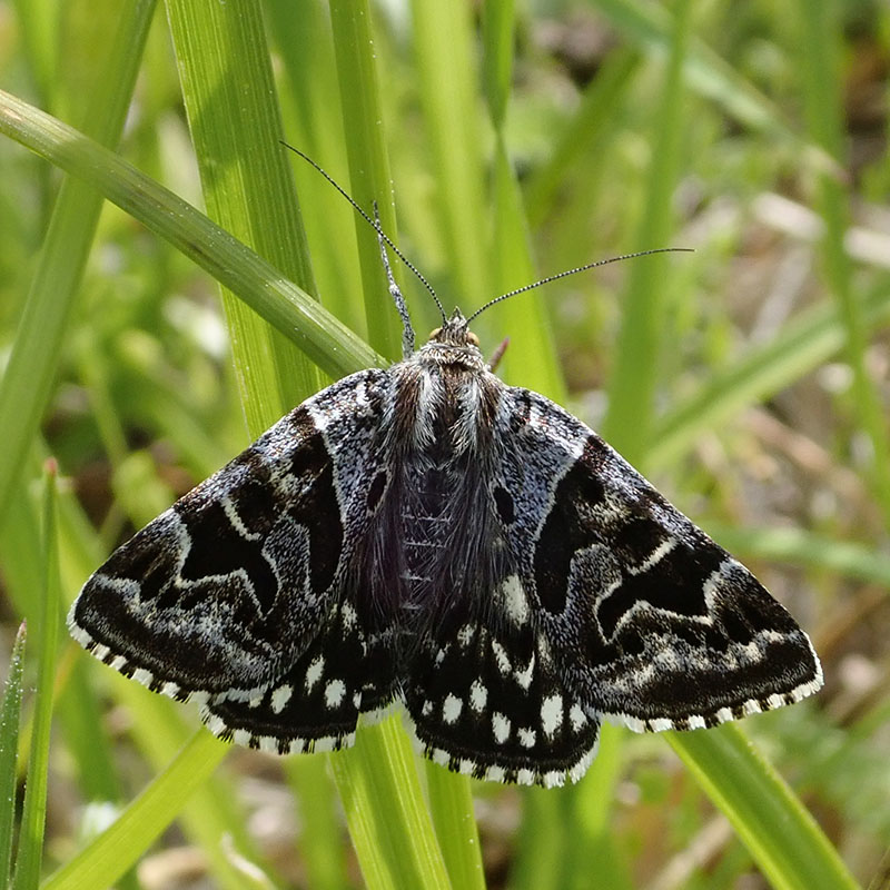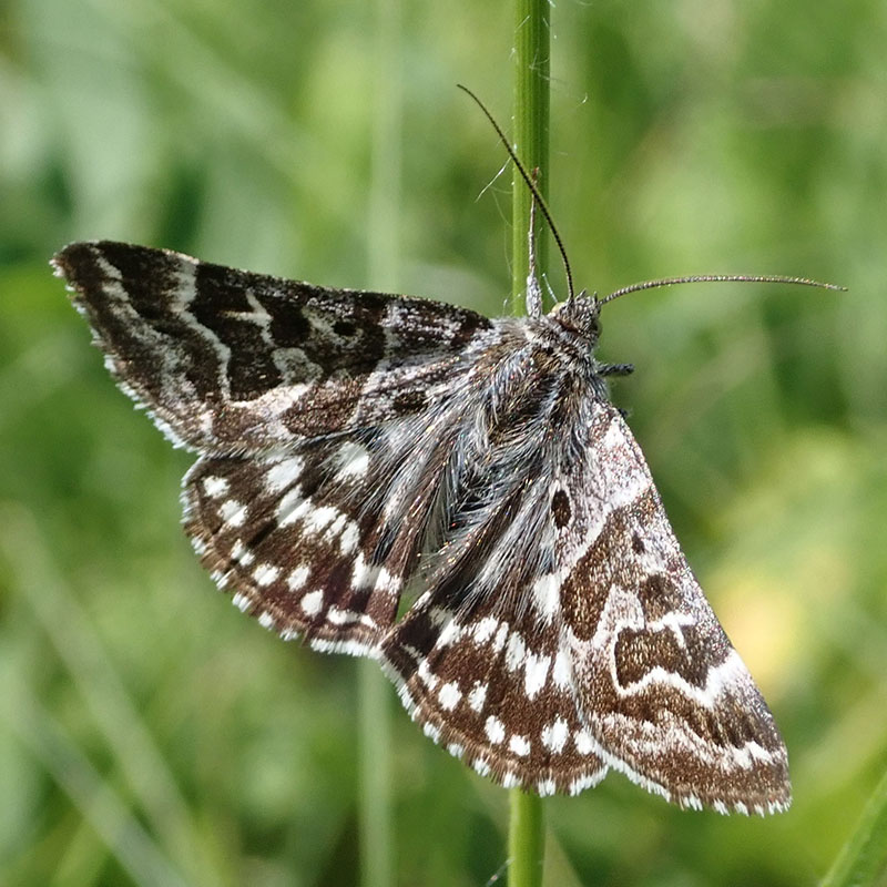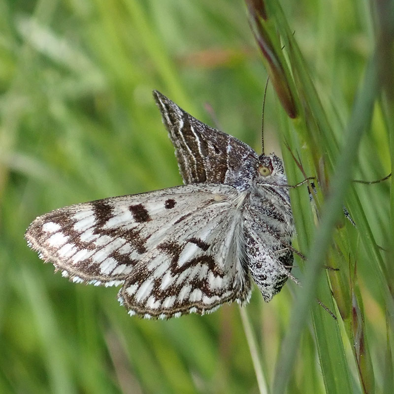 Ce papillon diurne aime les lieux ouverts, son vol est rapide mais sur une courte distance, il se repose vite dans les herbes denses où il peut facilement se cacher. Ses ailes antérieures présentent deux motifs brun foncé entouré d'un liseré blanc sur un fond gris clair. Le dessus des postérieures est brun foncé orné de lignes de points blancs. Le revers des ailes est plus clair formé de taches blanches en damier délimitées par les nervures noires des ailes et par des lignes transversales brun foncé assez épaisses. La marge des ailes est bicolore blanche entrecoupée de brun foncé. La ponte se produit généralement en groupe sur les limbes et les tiges près du sol. La nymphe hiberne.