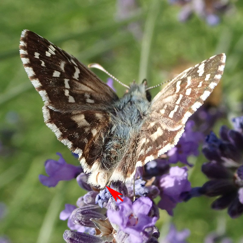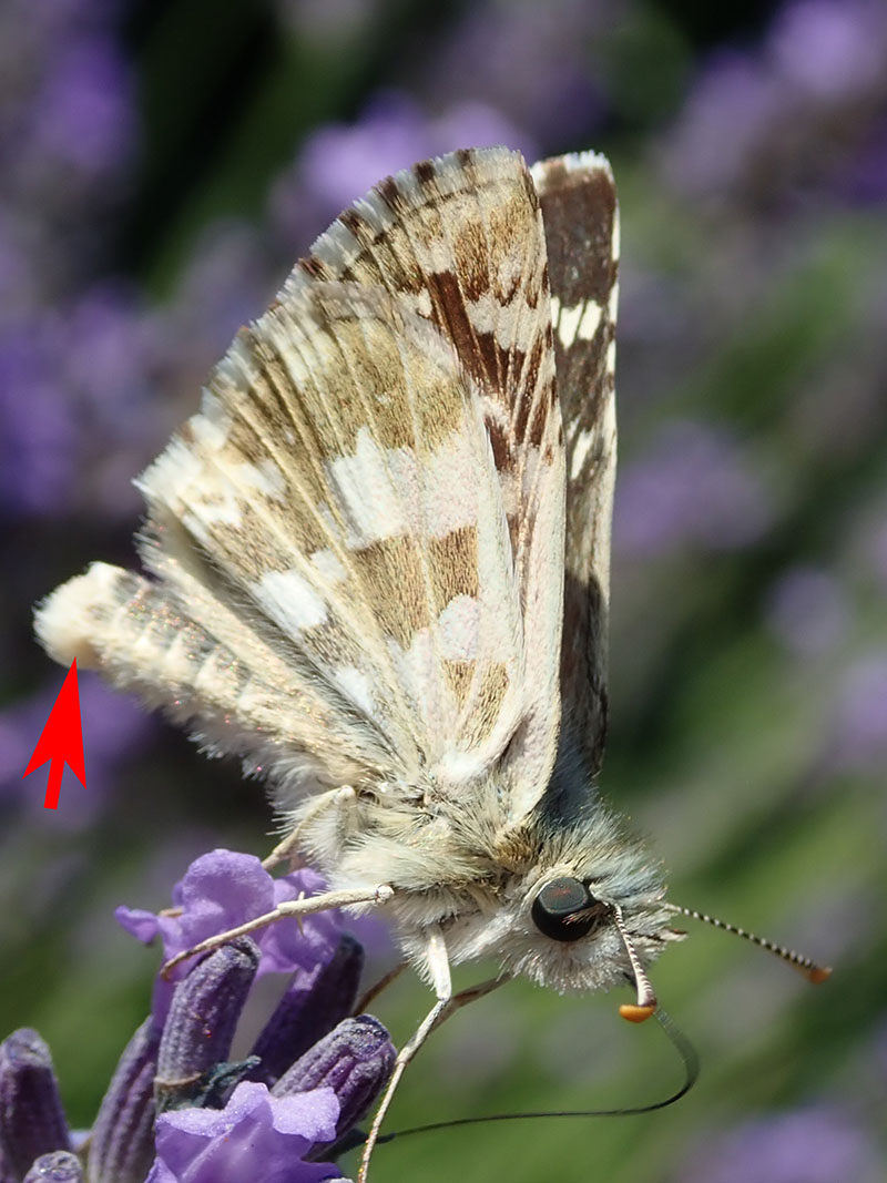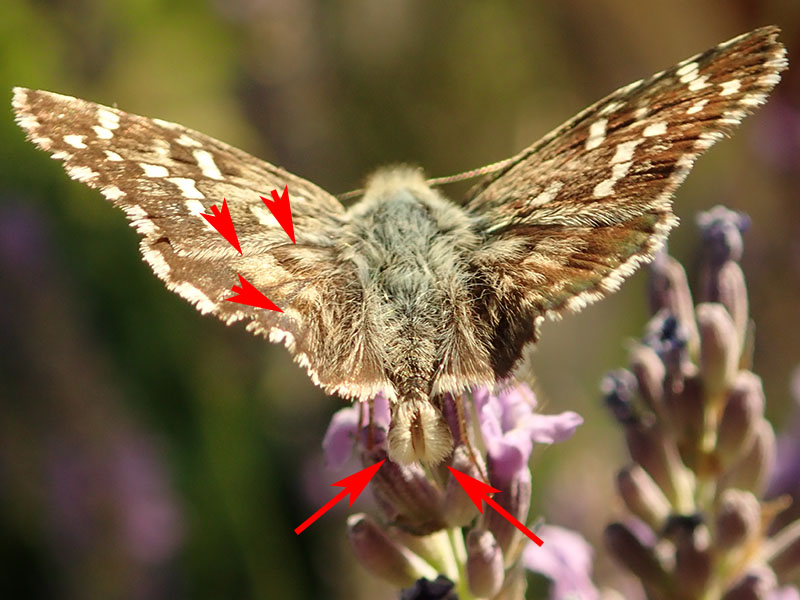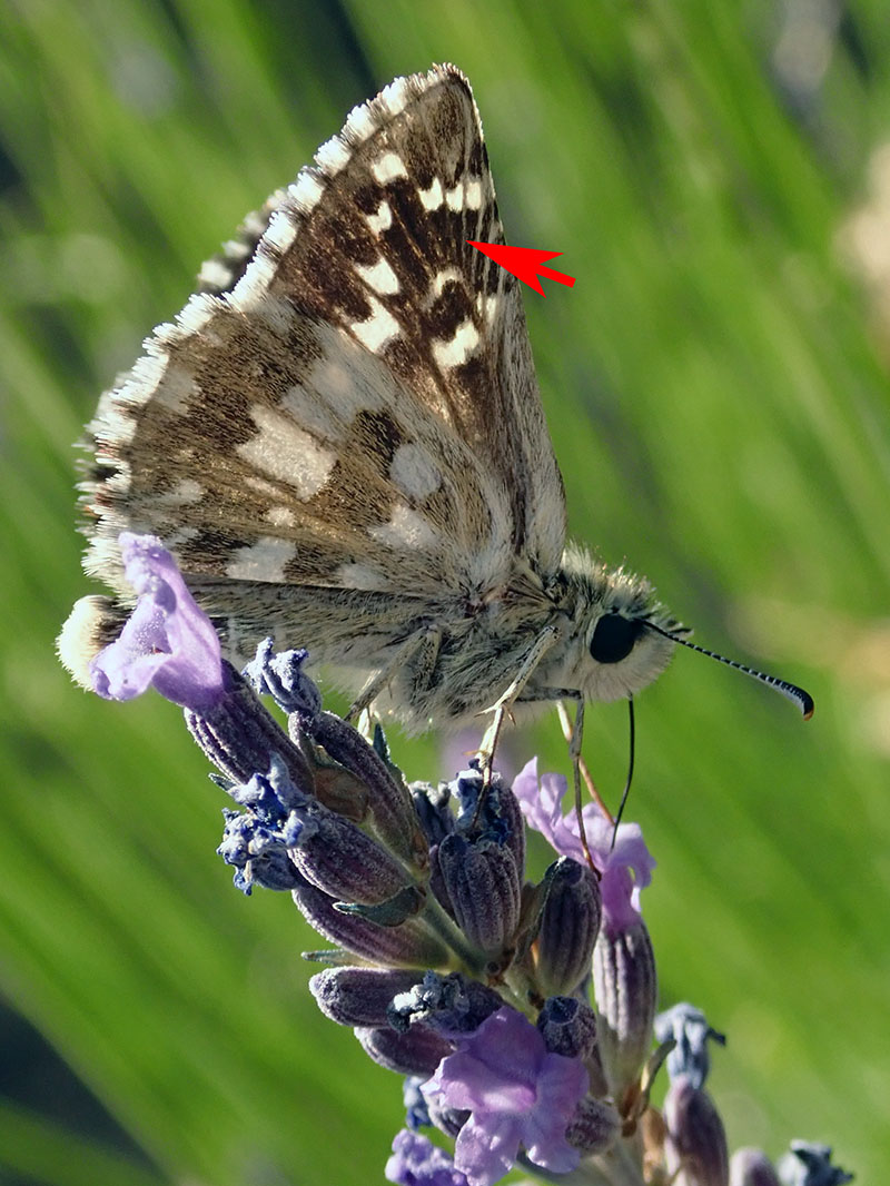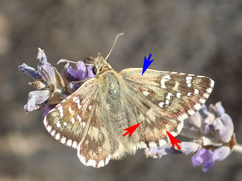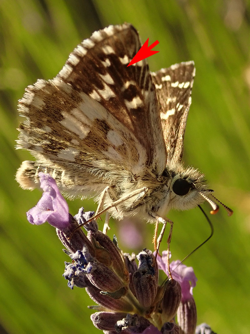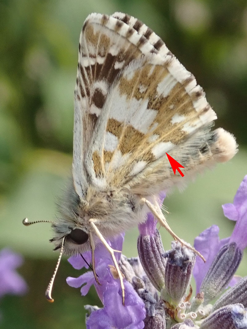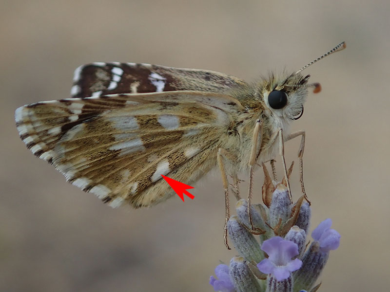 Revers des ailes postérieures avec cette tache blanche en forme de trapèze à la base beaucoup plus large que son côté opposé (flèche)