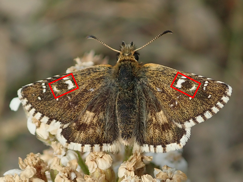 Dimorphisme sexuel La femelle a les taches blanches du dessus des ailes beaucoup plus petites.