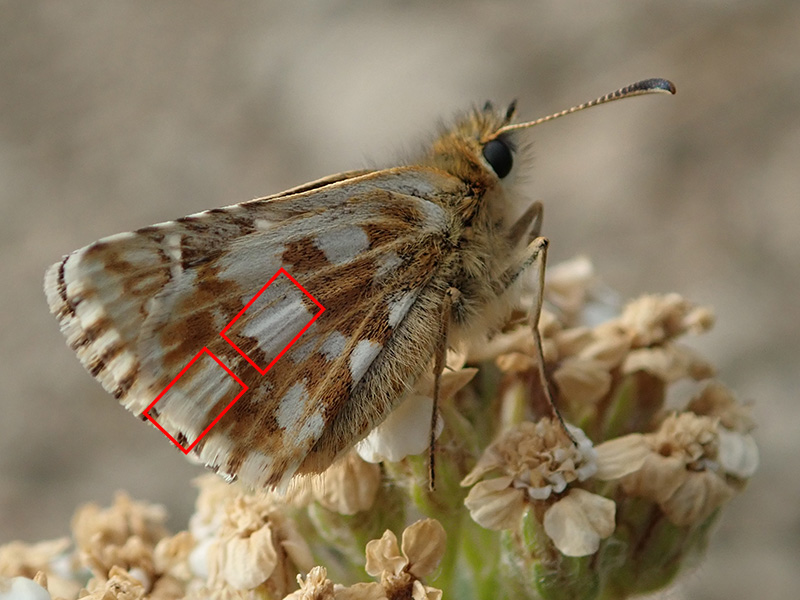 On rencontre l'hespérie du carthame en montagne, c'est un papillon de taille plus importante et on n'y retrouve pas la forme des taches encadrées en rouge sur les photos notamment le «C» dans la zone discale. Le revers est très différent avec un bord externe des ailes postérieures complètement blanc. Le risque de confusion est faible.
