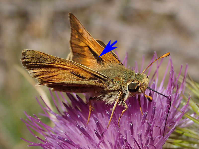 Dimorphisme sexuel Le mâle a une ligne androconiale sur le dessus des ailes antérieure et ses taches claires sont moins contrastées.