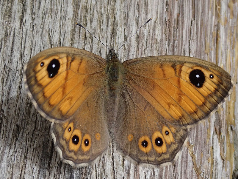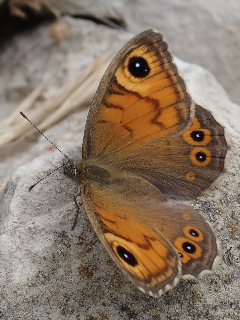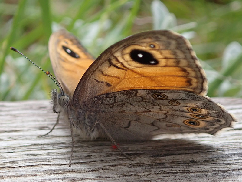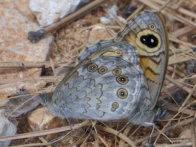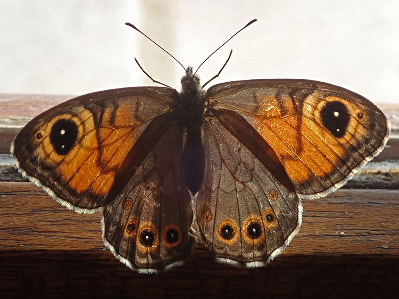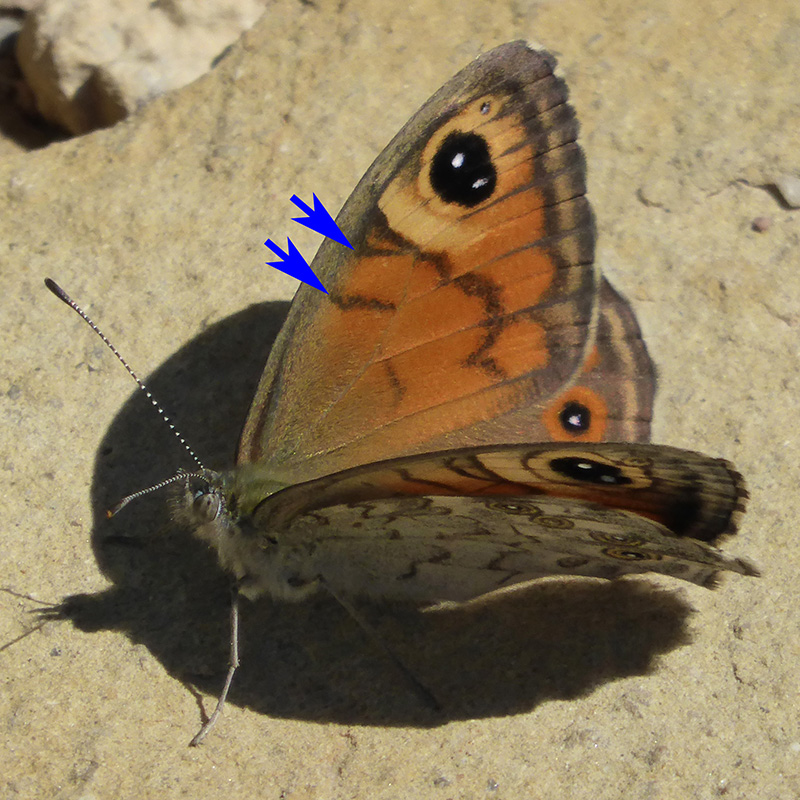 Femelle vu à contrejour avec ocelle apical doublement pupillé et accompagné d'un tout petit ocelle plus à la pointe de l'aile