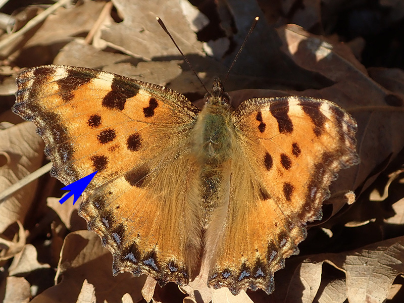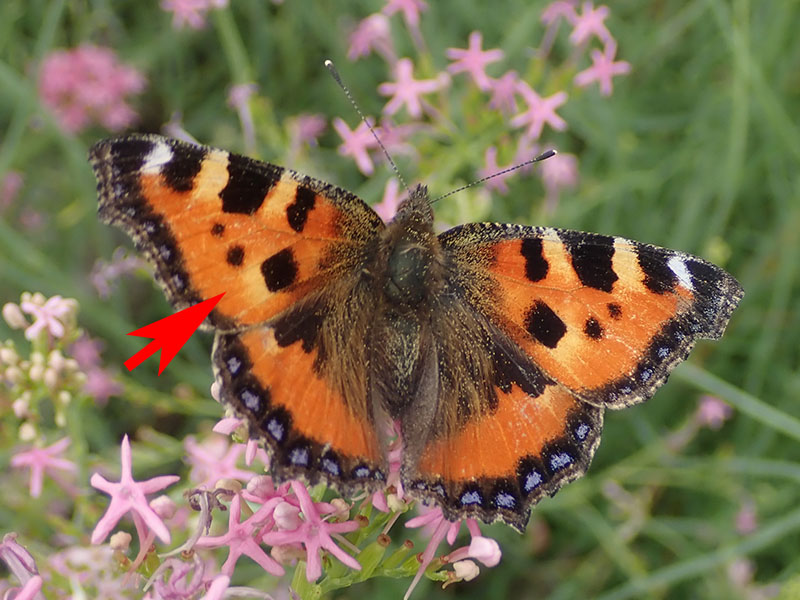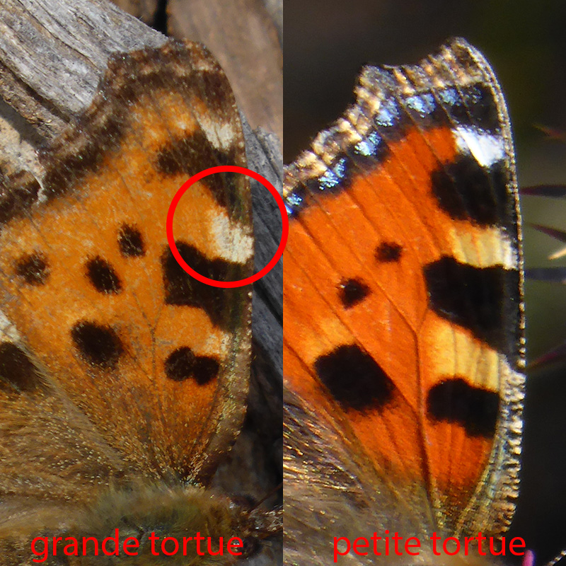 Les taches jaunâtres sont plus courtes chez la grande tortue. Présence d'une tache blanche et de lunules bleues larges sur les antérieures de la petite tortue.