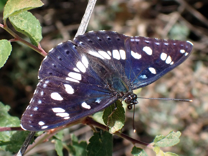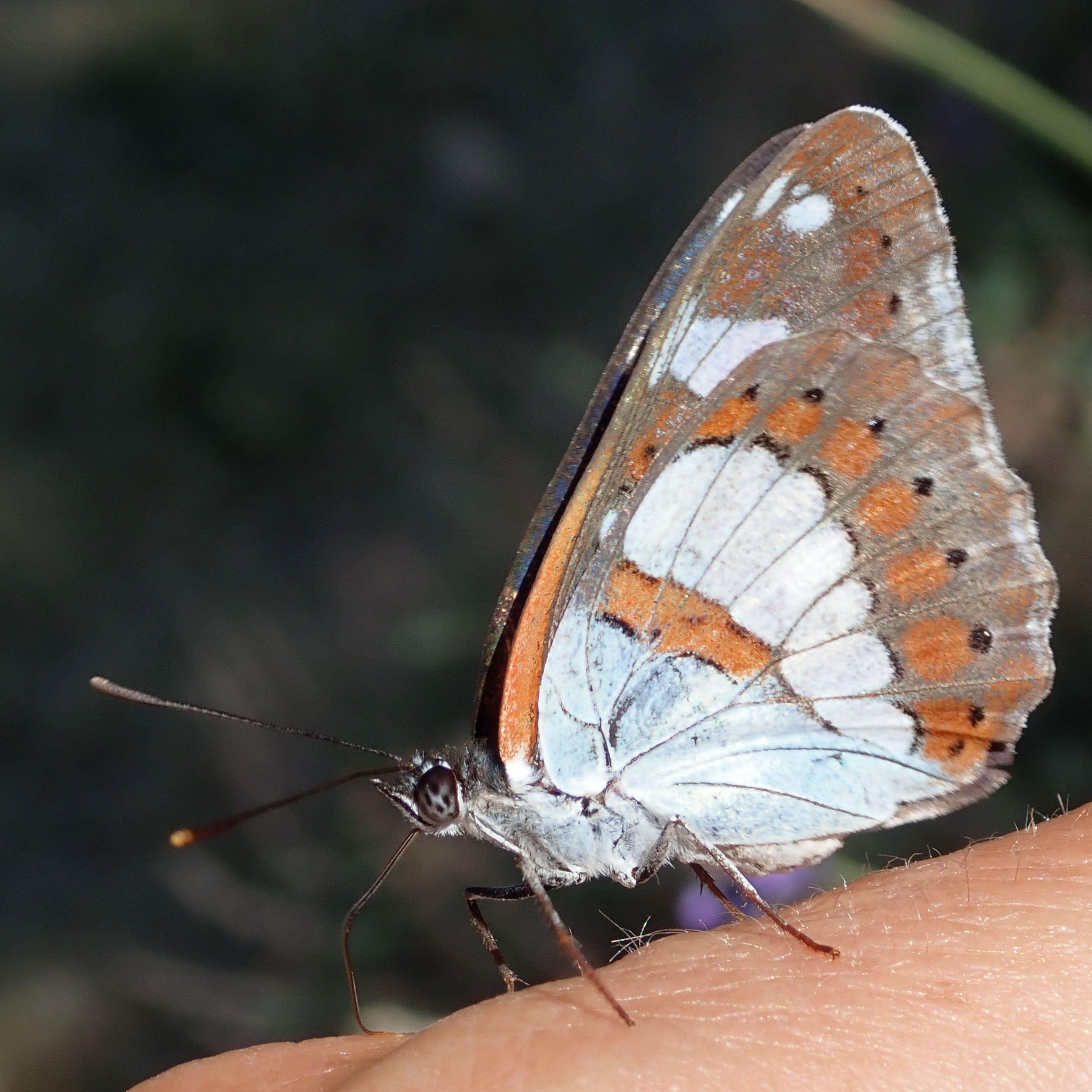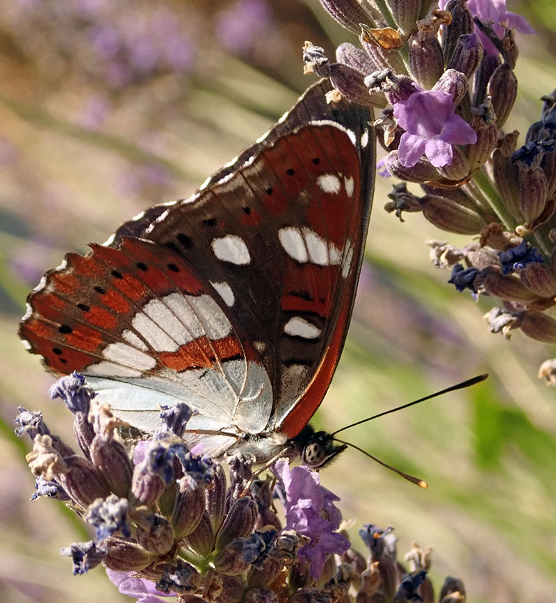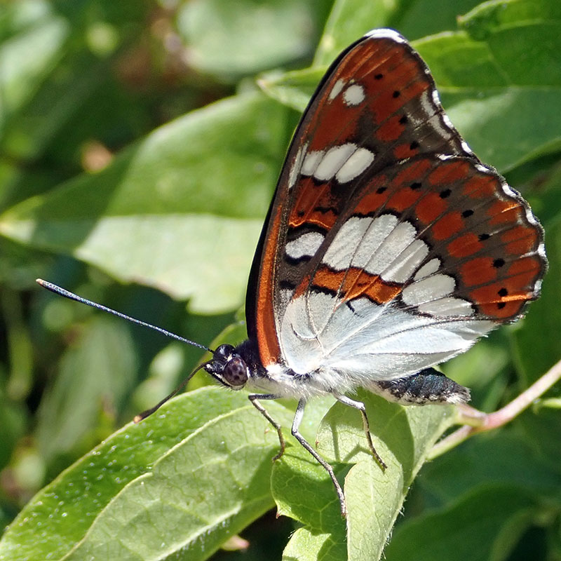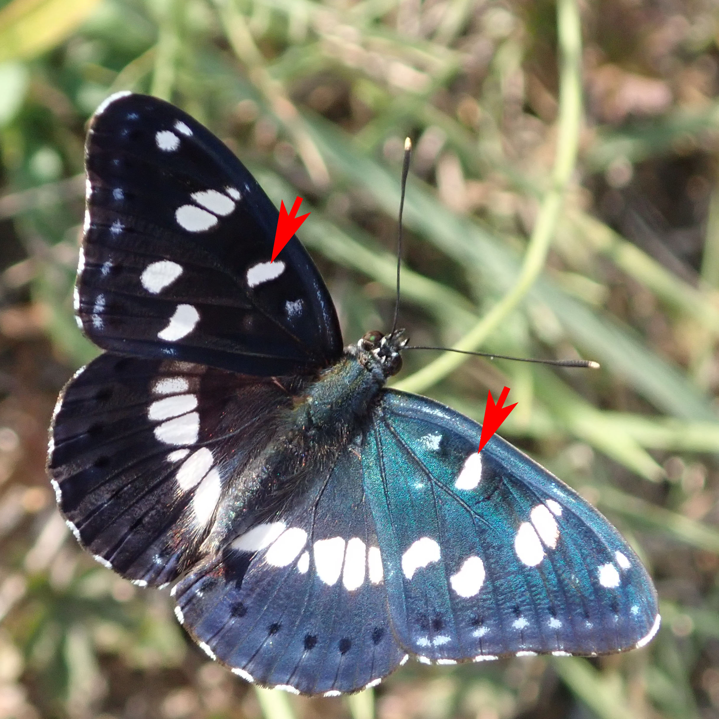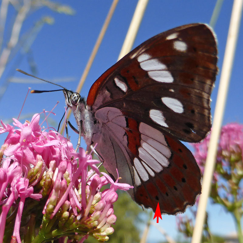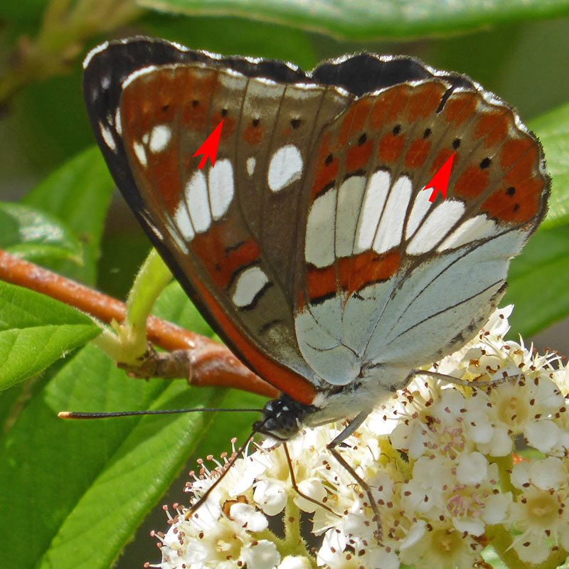 Dessous des ailes brun orangé ou brun rougeâtre avec de grosses taches blanches et la base de l'aile postérieure blanche