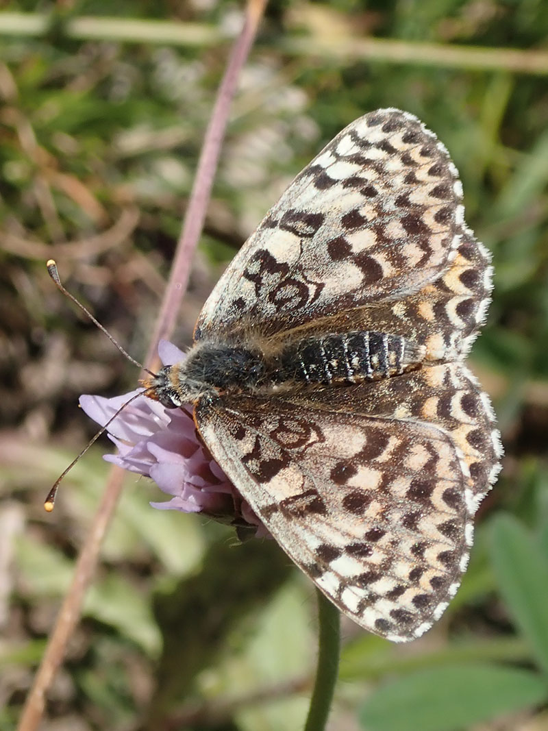 La mélitée des centaurées a des dessins formant un quadrillage sur le dessus des ailes. Au revers des postérieures, elle est ornée d'une ligne de lunules jaunes avec des points orange dans l'aire postmarginale.