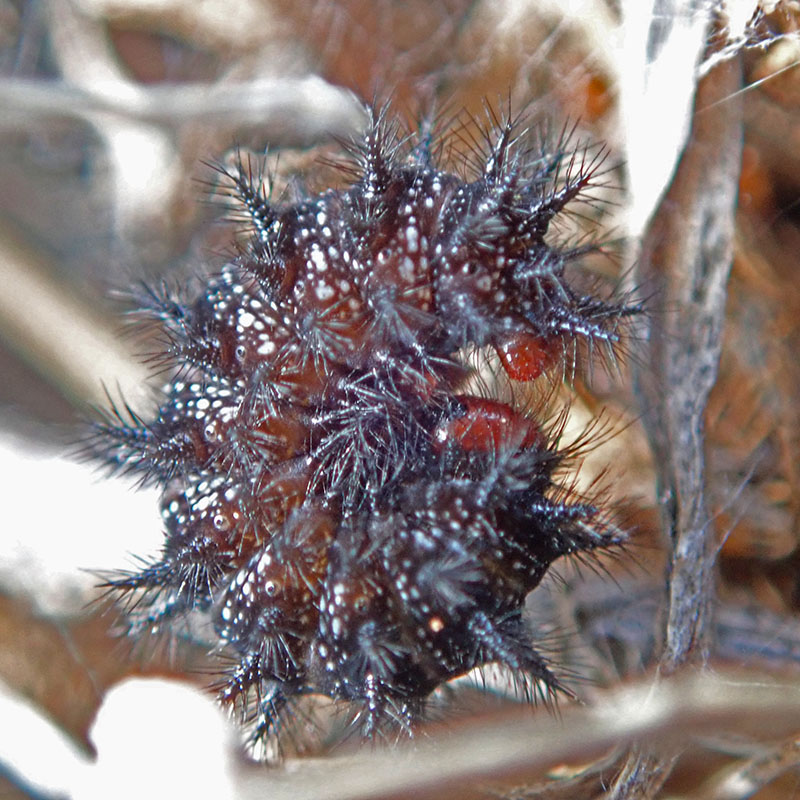 Spécimen à peine sorti de la nymphe montrant bien la décoration des ailes postérieures avec les taches submarginales orange centrées d'un point noir (caractéristique propre à l'espèce)