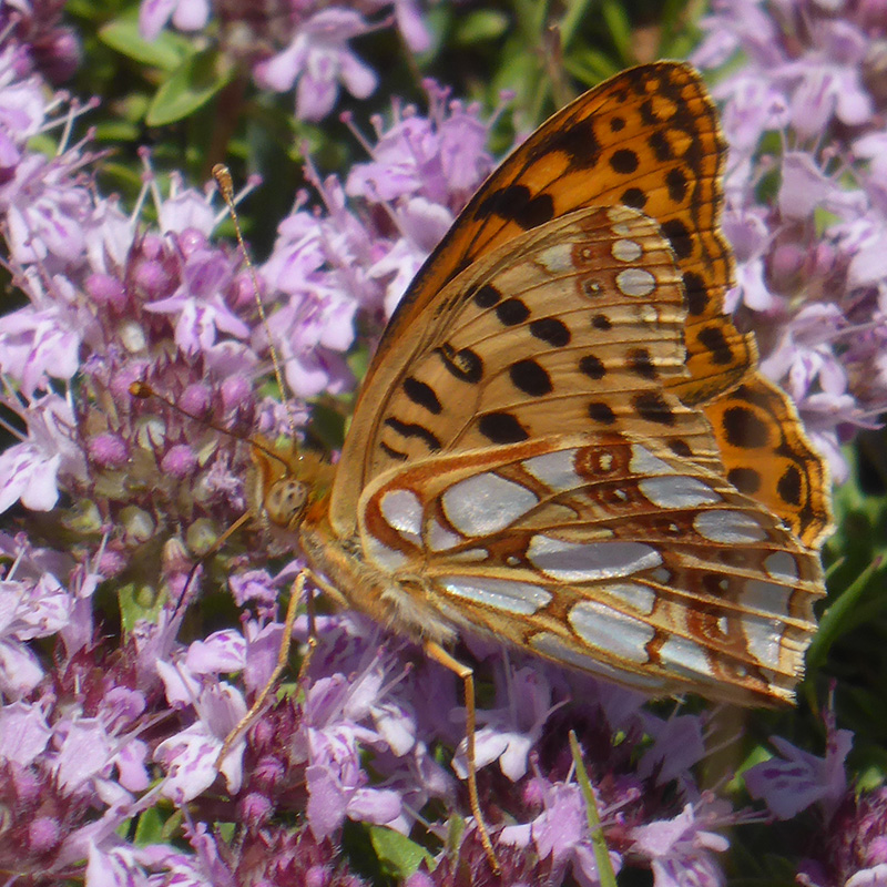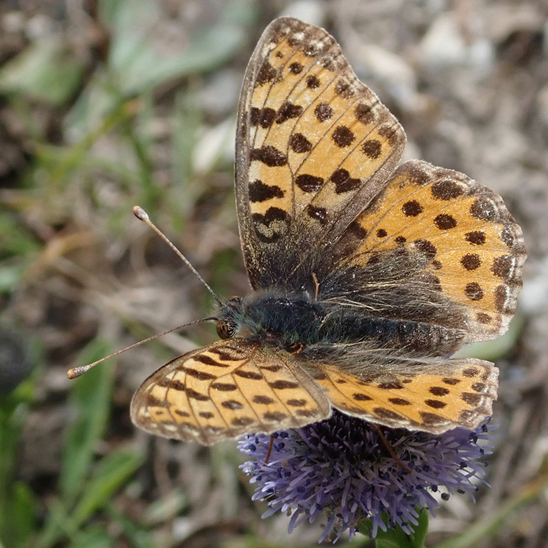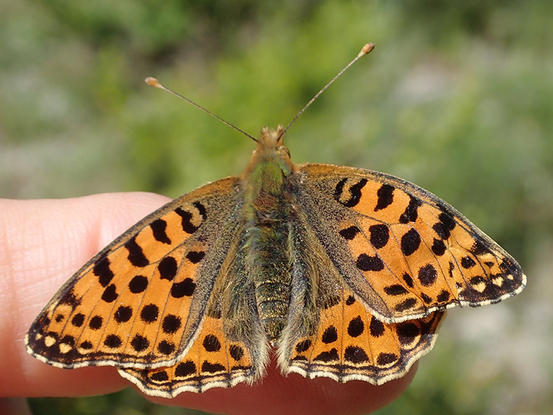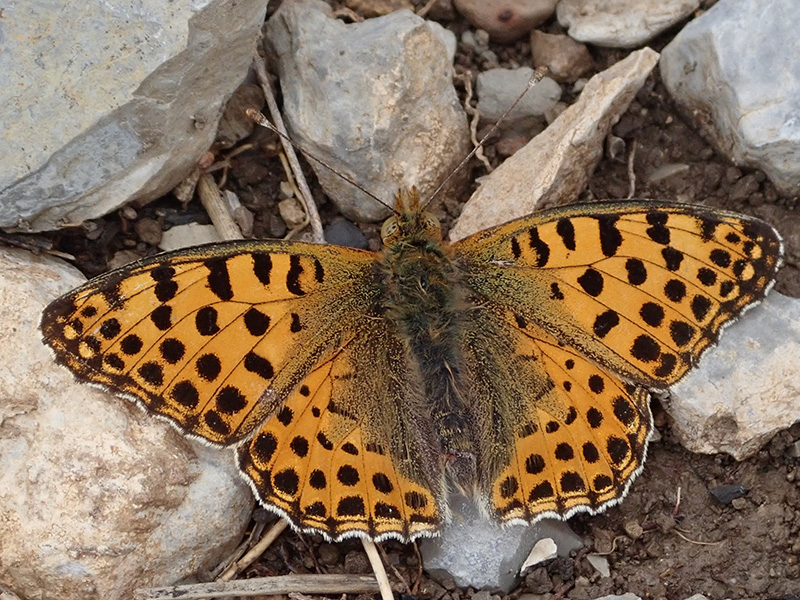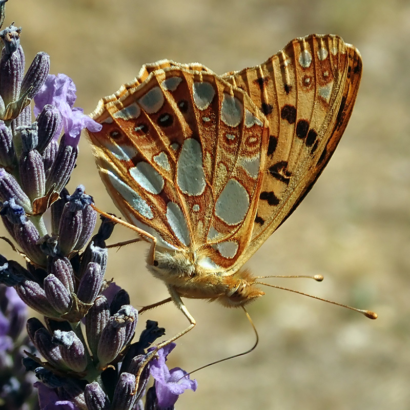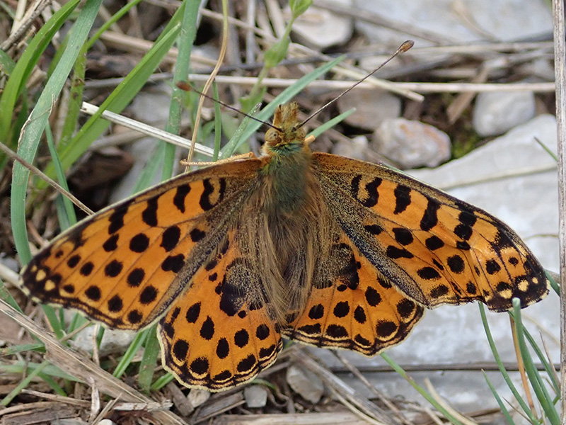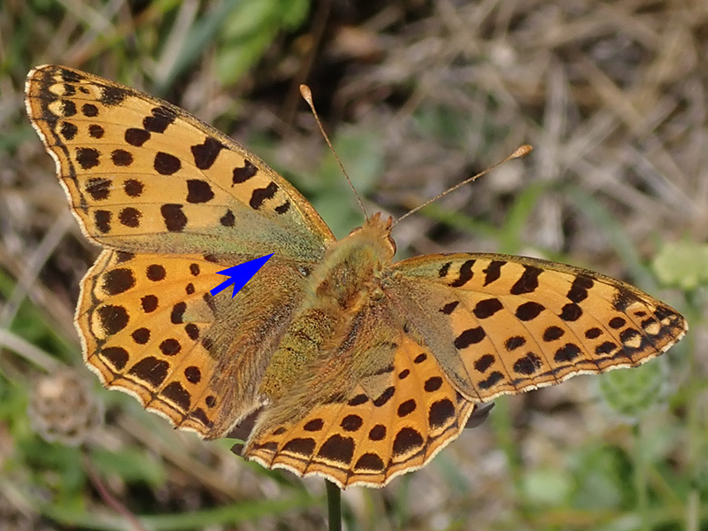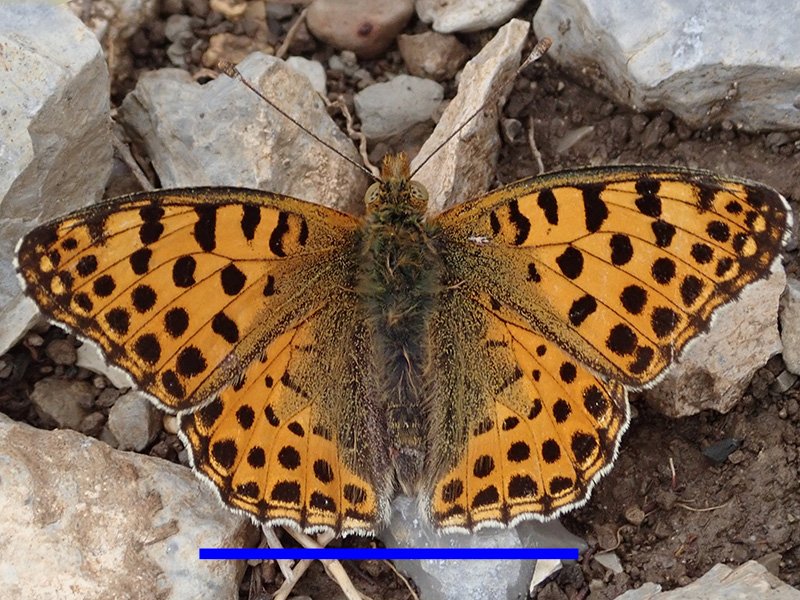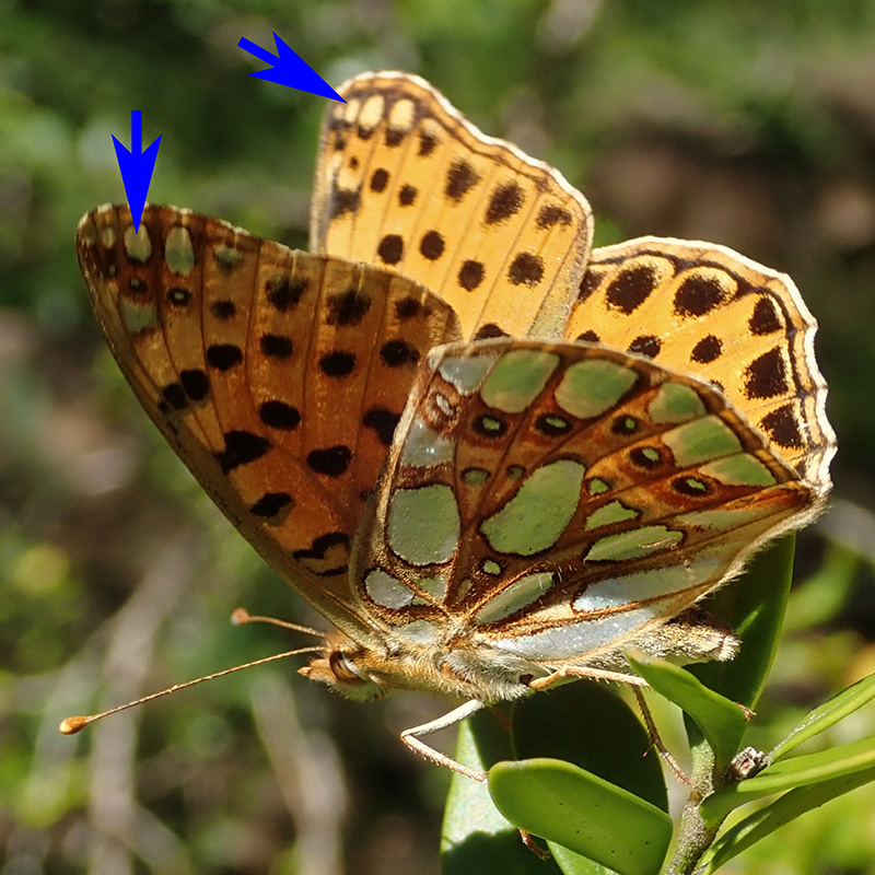 Papillon plus grand, taches nacrées nombreuses mais proportionnellement plus petites. Une seule ligne de points sur les ailes antérieures.