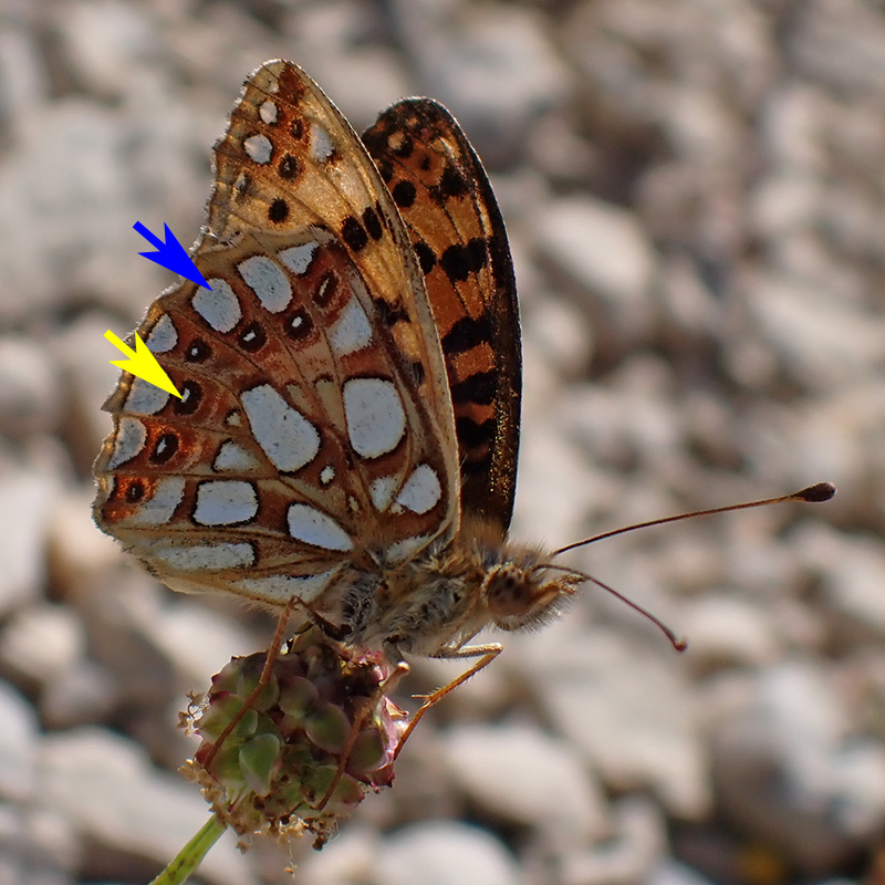 Une ligne marginale de grosses taches blanc nacré (flèche bleue) et une ligne postmarginale d'ocelles brun rouge pupillés de blanc(flèche jaune)
