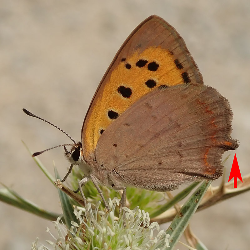 Le dessus des ailes de la femelle du cuivré des marais ressemble à celui du cuivré commun, mais elle n'a pas ni petite queue ni de points bleus sur les postérieures ; le revers est franchement différent