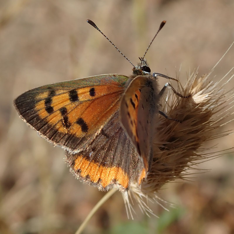 Papillon très répandu, le plus courant des lycènes orange. Il a un comportement territorial marqué et chasse les intrus. Le dessus des ailes antérieures est orange, avec des taches noires et une bordure marron. Le dessus des ailes postérieures est marron foncé avec une bande orange. Le revers des ailes antérieures est orange orné de points noirs cerclés de blanc. Celui des ailes postérieures est beige avec une bande orange pâle et des points noirs peu distincts.
