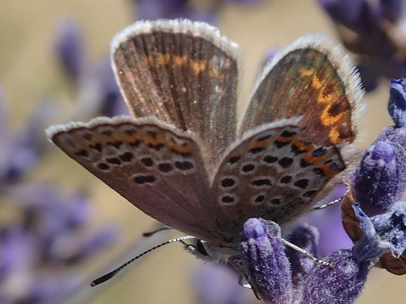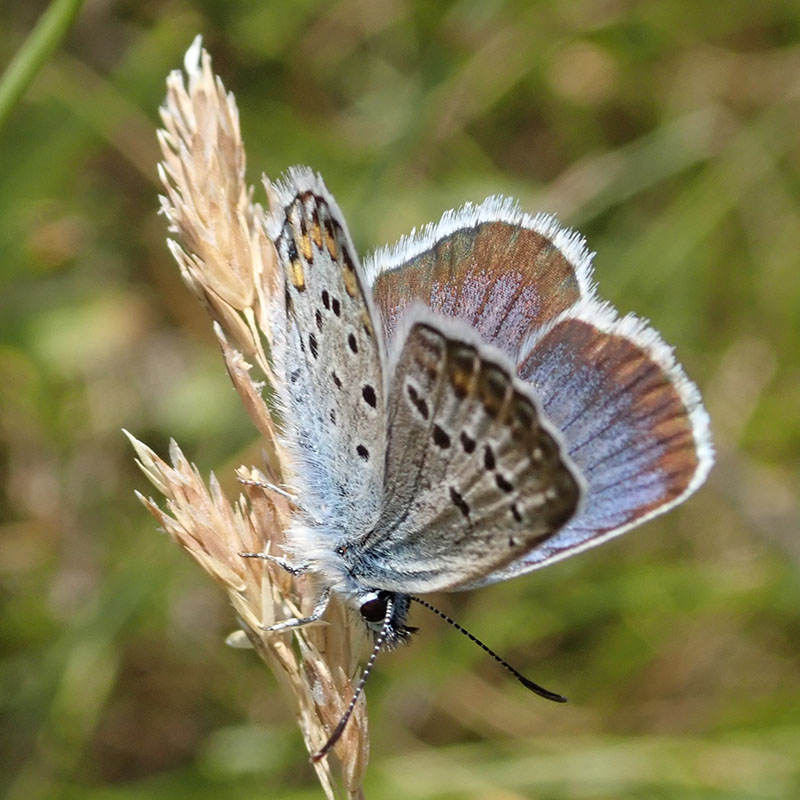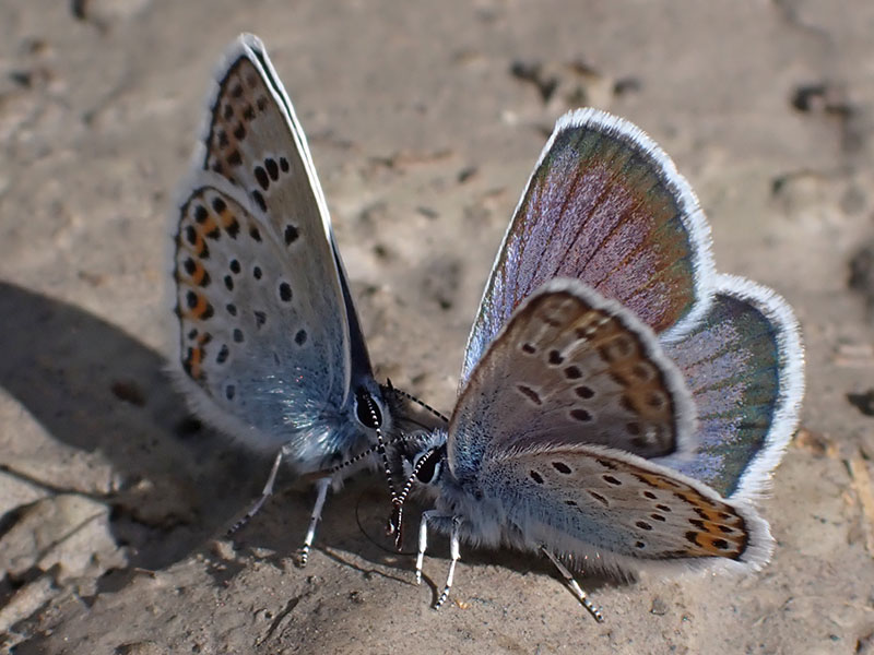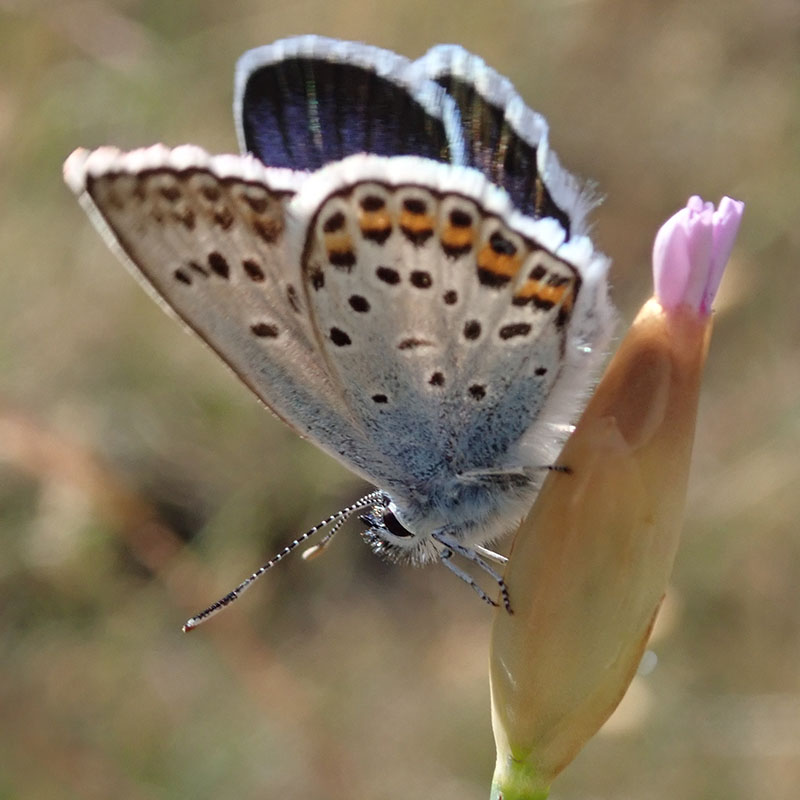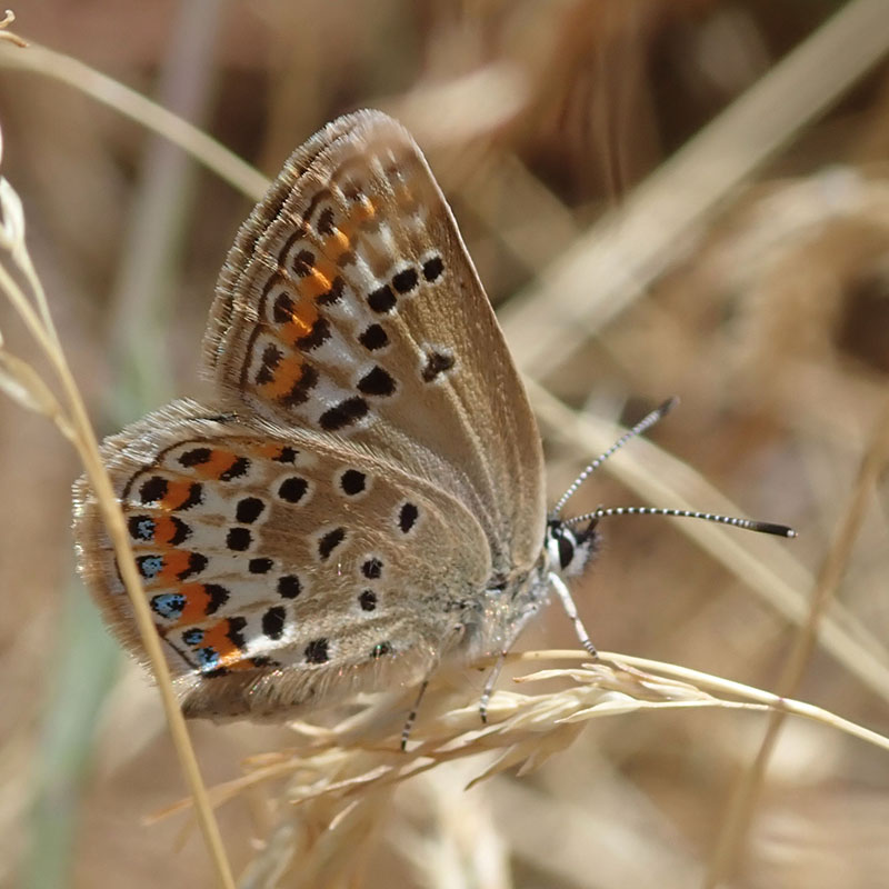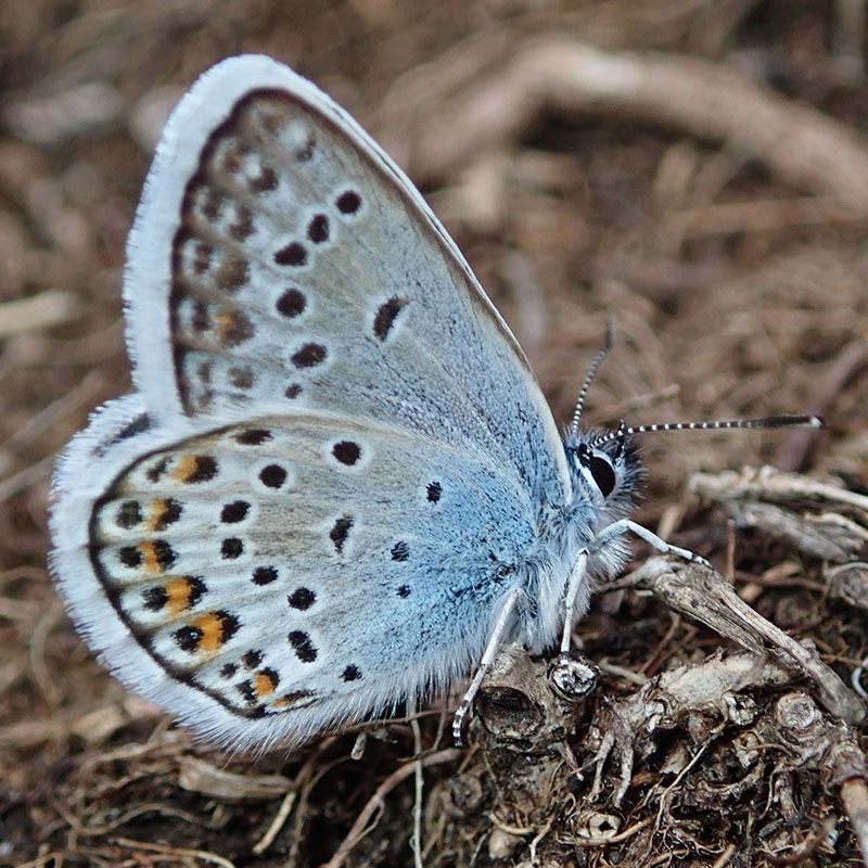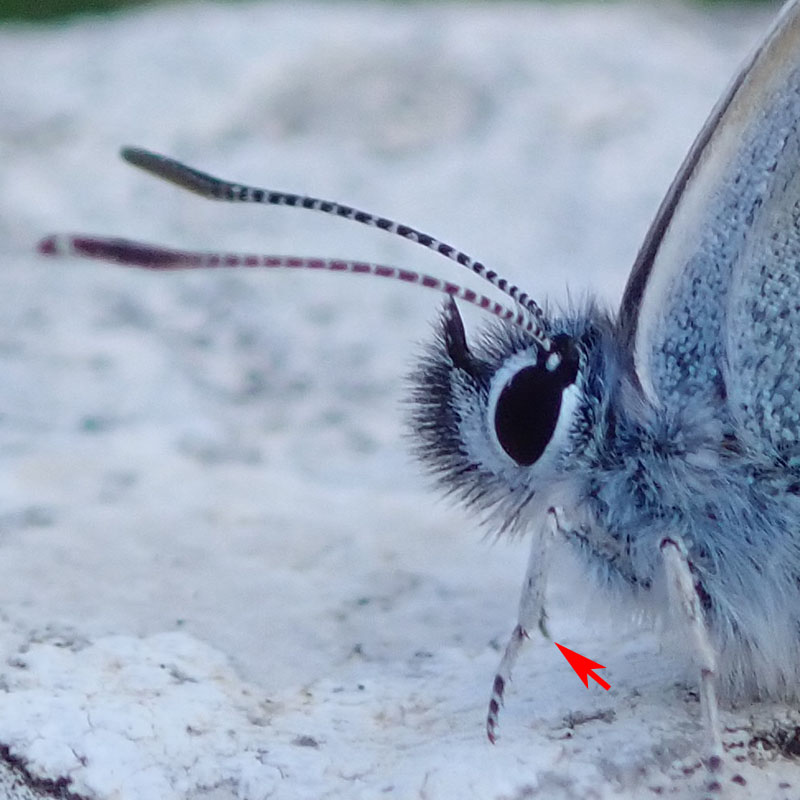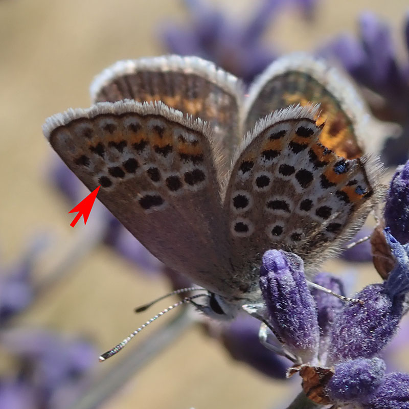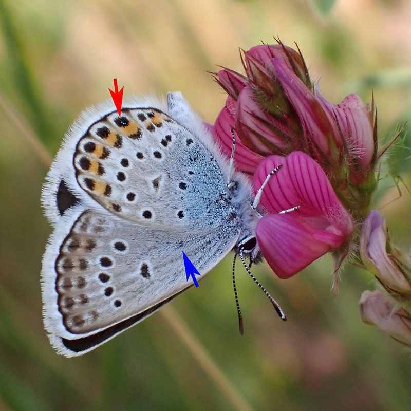 Mâle, écailles bleues discrêtes mais indiquant sans erreur le genre Plebejus (flèche rouge), pas d'ocelle discal (flèche bleue)