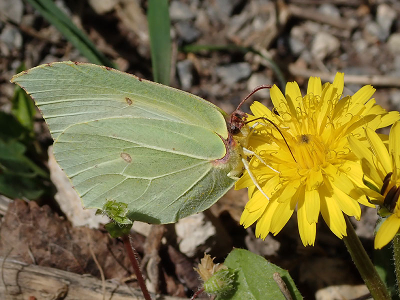 Le citron est un papillon très commun et facile à observer du moins côté revers car il referme les ailes dès qu'il se pose. C'est l'un des papillons les plus précoces car l'adulte hiberne à l'état d'imago caché dans les cavités des arbres ou dans des feuillages persistants (lierre par exemple). Il se réveille aux premières chaleurs du printemps pour s'alimenter en butinant les premières fleurs. C'est aussi un papillon qui jouit d'une longévité importante : plus d'une année. Le citron est un grand papillon qui peut atteindre 70 mm d’envergure. Le mâle a le dessus des ailes couleur soufre avec une petite tache orange dans la cellule de chacune des ailes. La femelle est blanche ou jaune blanchâtre avec les mêmes taches orange. Les ailes ont un apex très anguleux et on note la présence d'une petite pointe à l'angle anal. Les oeufs sont pondus sur la face inférieure des feuilles de la plante hôte, La chenille émerge après une période d'incubation d'environ deux semaines. Après 4 mues et environ 4 semaines, la chenille se suspend à une feuille pour former sa chrysalide qu'elle suspend sous une feuille. L'émergence de l'imago se produit deux semaines plus tard.