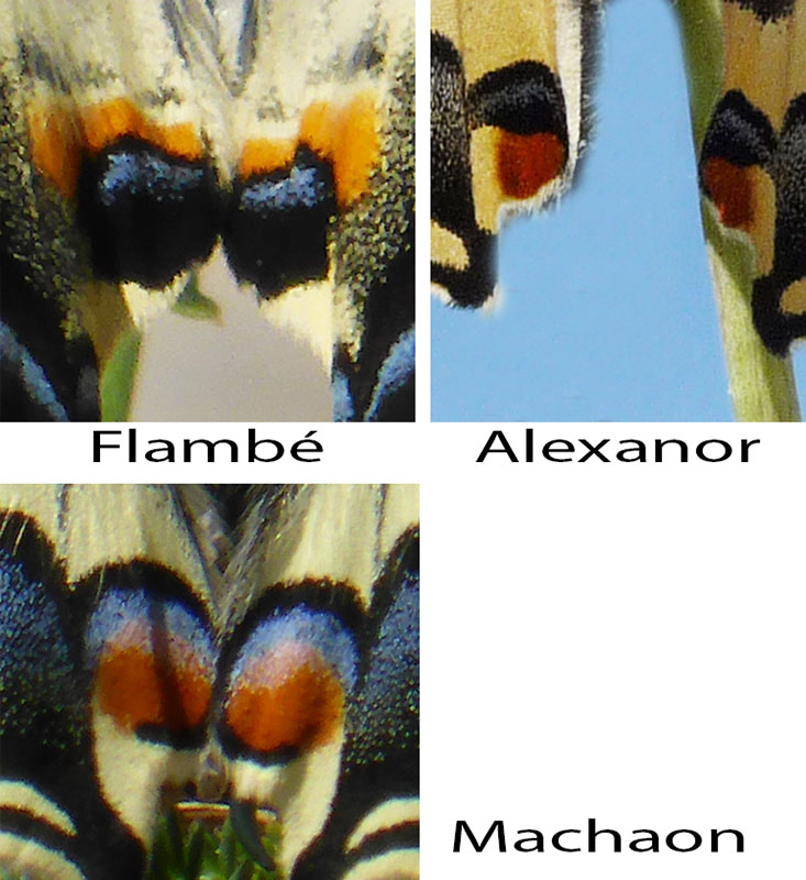 Le flambé ressemble plus à l'alexanor, cependant il est blanc jaunâtre plus pâle. Six lignes noires traversent ses ailes antérieures, contre 4 pour l'alexanor. Sur les spécimens «usés», il faut s'assurer de la présence de la large ligne gris bleuté entourée de noir qui traverse intégralement l'aile antérieure dans l'aire submarginale et qui se poursuit sur l'aile postérieure. Les taches anales sont aussi utiles pour les différencier (voir photo).