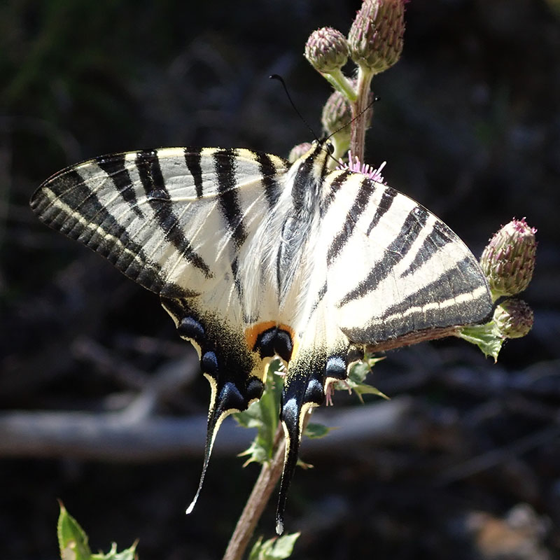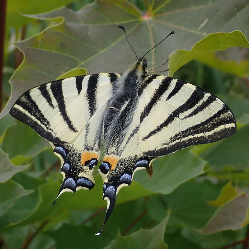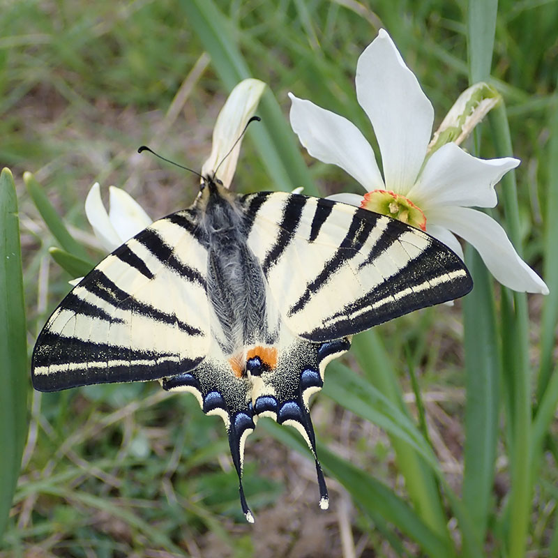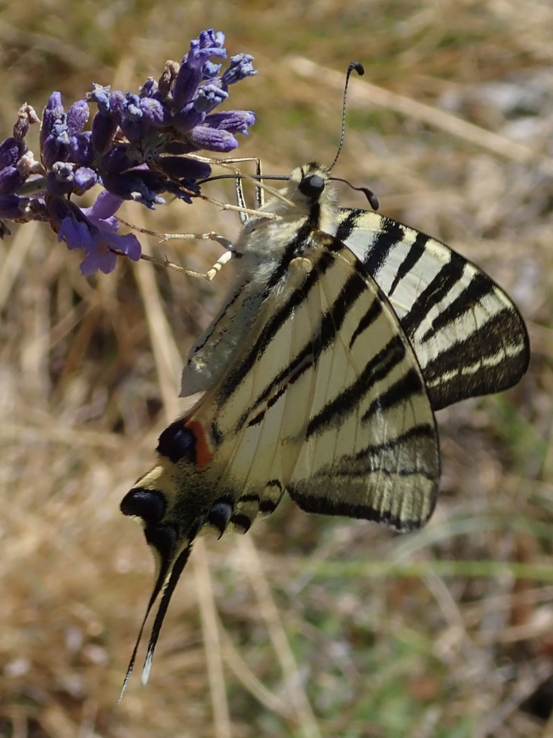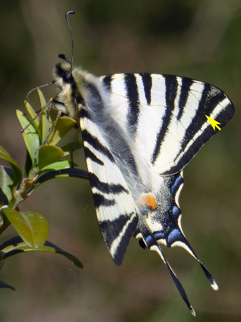 Papillon doté de deux queues très longues, la deuxième bande noire en partant de la côte (flèche jaune) ne traverse pas intégralement l'aile, différence avec l'alexanor