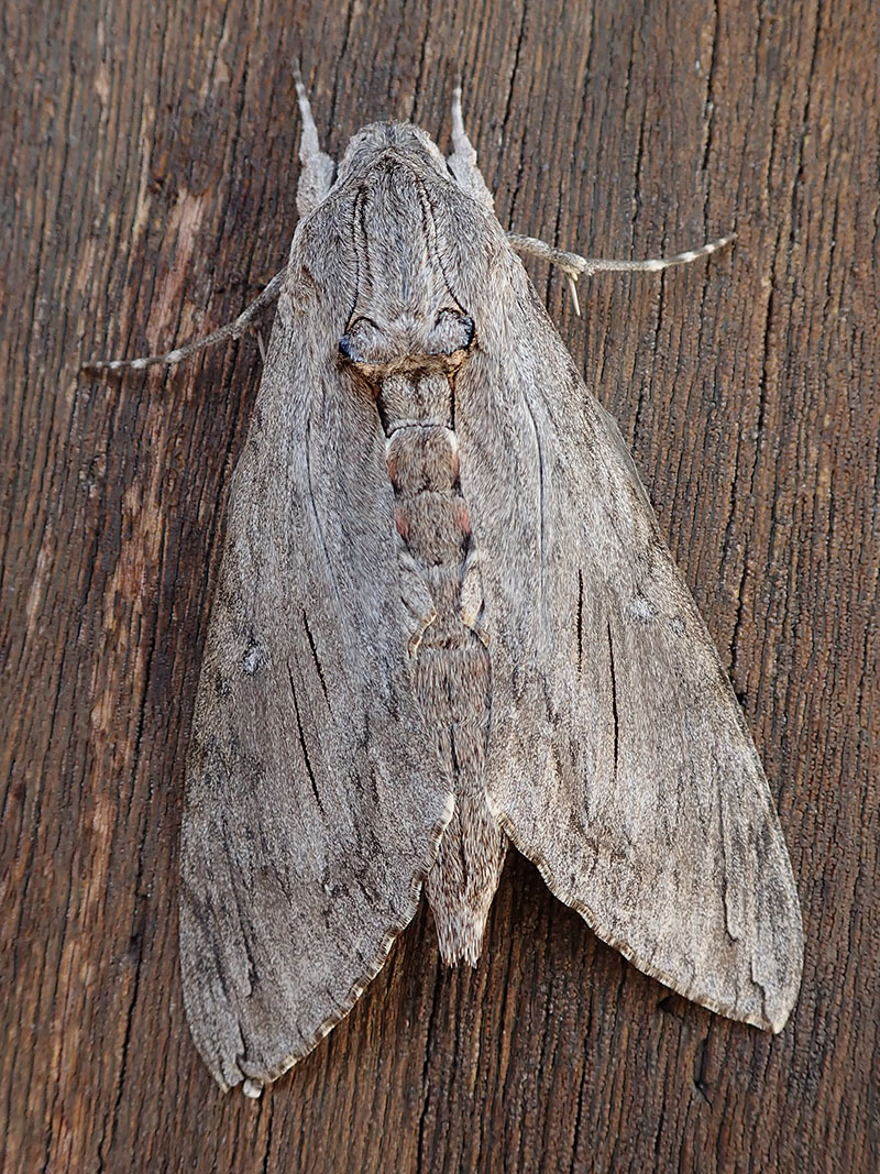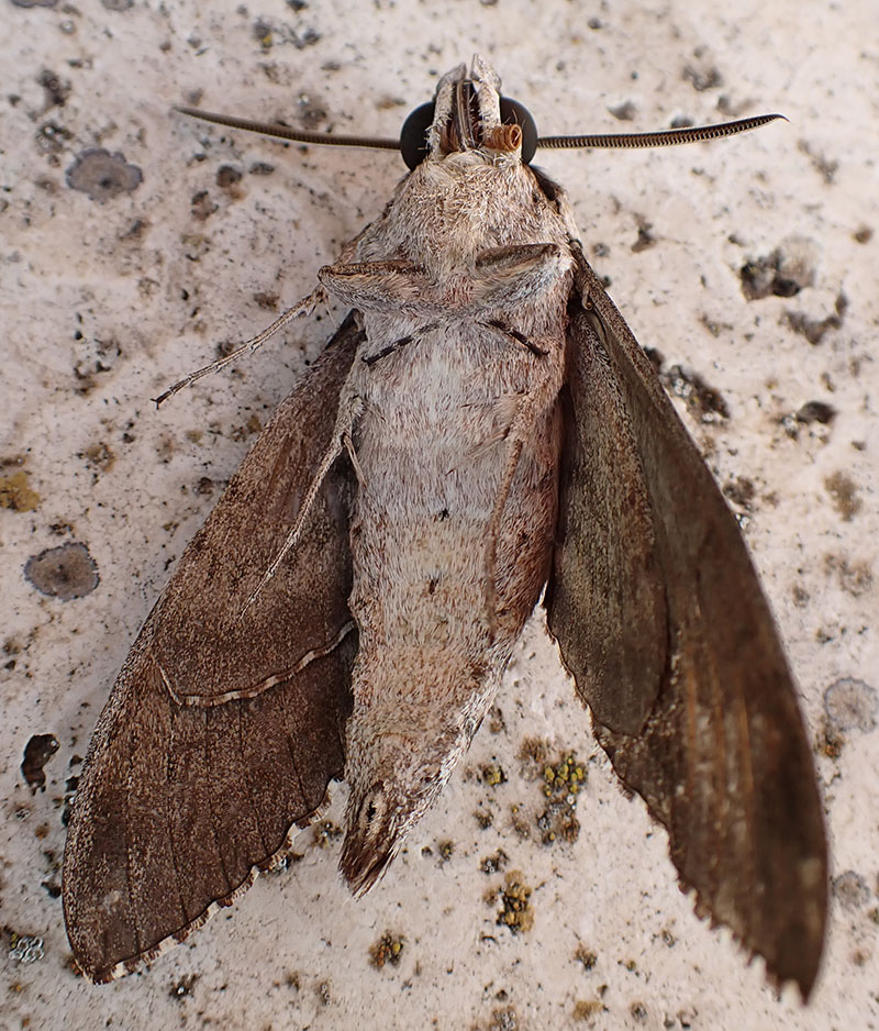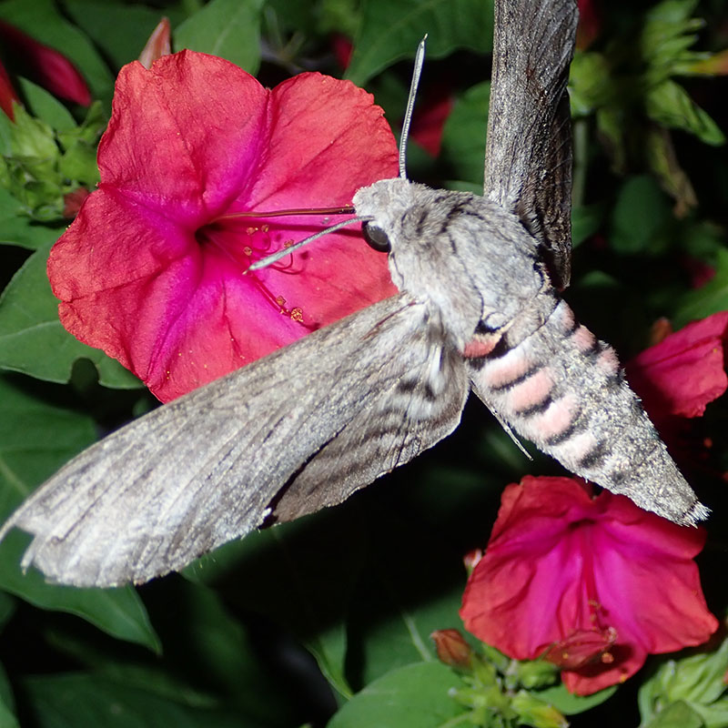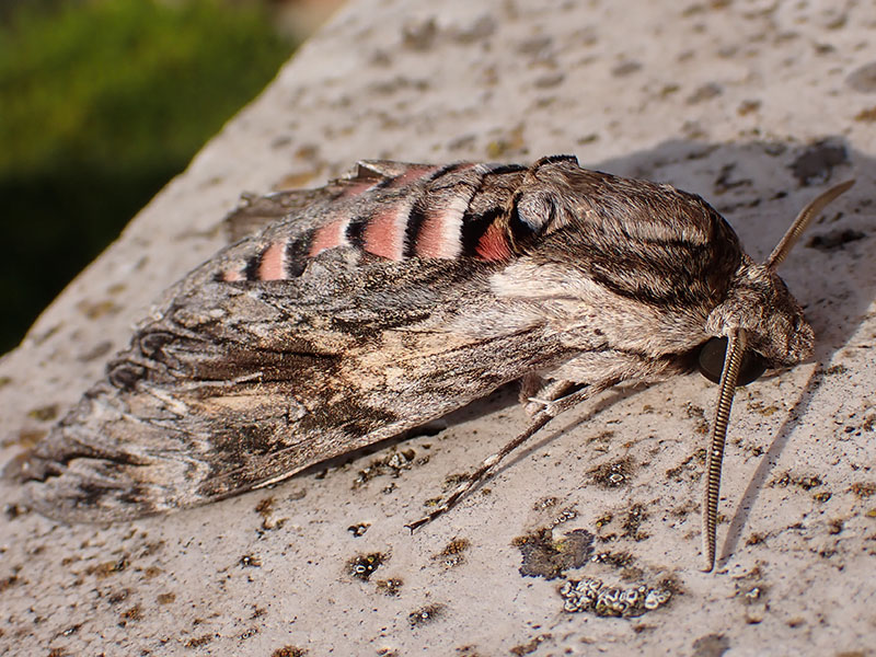 Papillon migrateur venant d'Afrique du Nord, le sphinx du liseron est présent dans toute la France ou presque pendant la saison estivale. C'est un papillon plutôt nocturne mais il commence sa quête de nectar avant la tombée de la nuit, ce qui permet de le voir à l'oeuvre, notamment autour des potées de petunia. C'est un papillon très impressionnant par sa vitesse, sa taille et la précision de son vol mais aussi par la taille de sa trompe plus longue que le corps. De couleur grise ou brun gris, c'est son abdomen strié de rose qui permet de le reconnaître facilement. Ses ailes sont grises avec des marbrures brunes avec sur les ailes antérieures des motifs blancs en zigzag peu visibles et sur les postérieures une alternance de lignes transversales brunes, noires et blanches. Sa trompe est très longue, plus longue que le corps et lui permet de visiter facilement les grandes corolles en entonnoir.