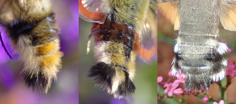 Comparaison de l'abdomen des sphinx diurnes, de gauche à droite : sphinx bourdon, sphinx fuciforme, moro-sphinx.