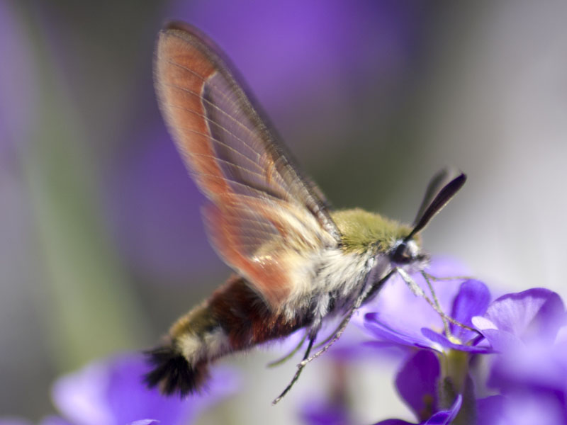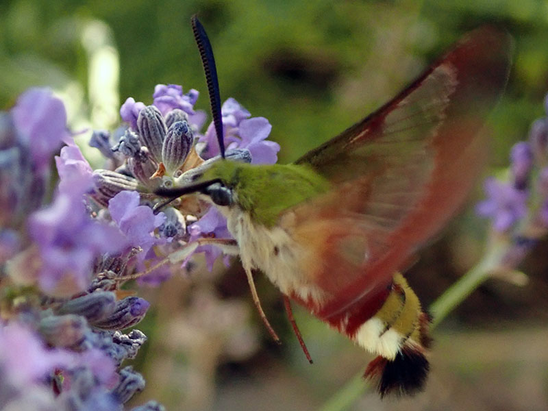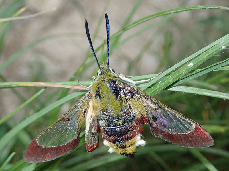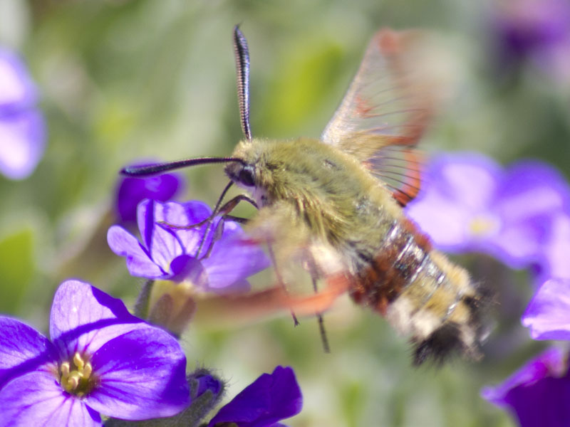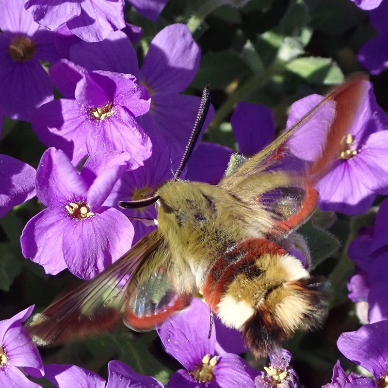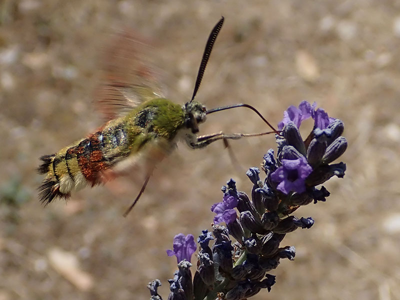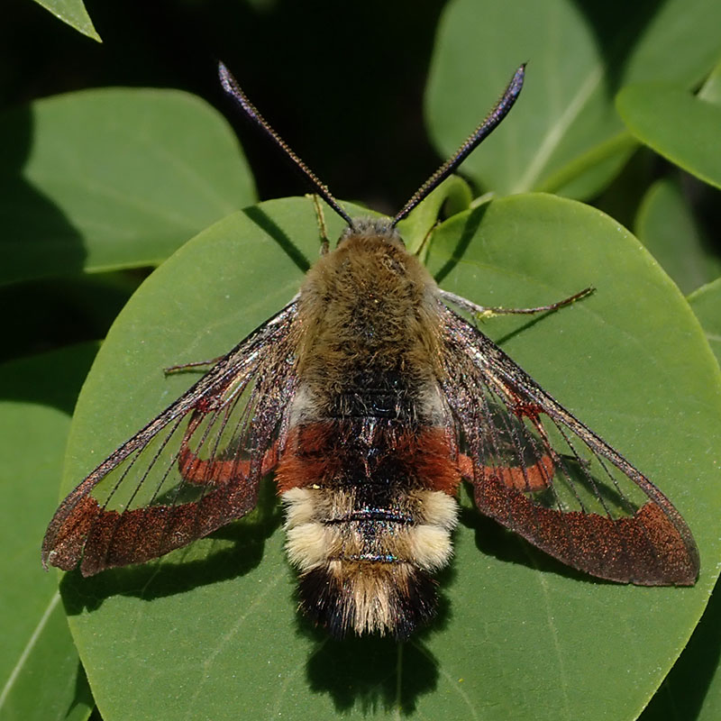 Le sphinx bourdon a les ailes transparentes avec les bords brun-rouge et l'abdomen a deux anneaux jaunes (voir la photo «comparaison des abdomens» plus bas).