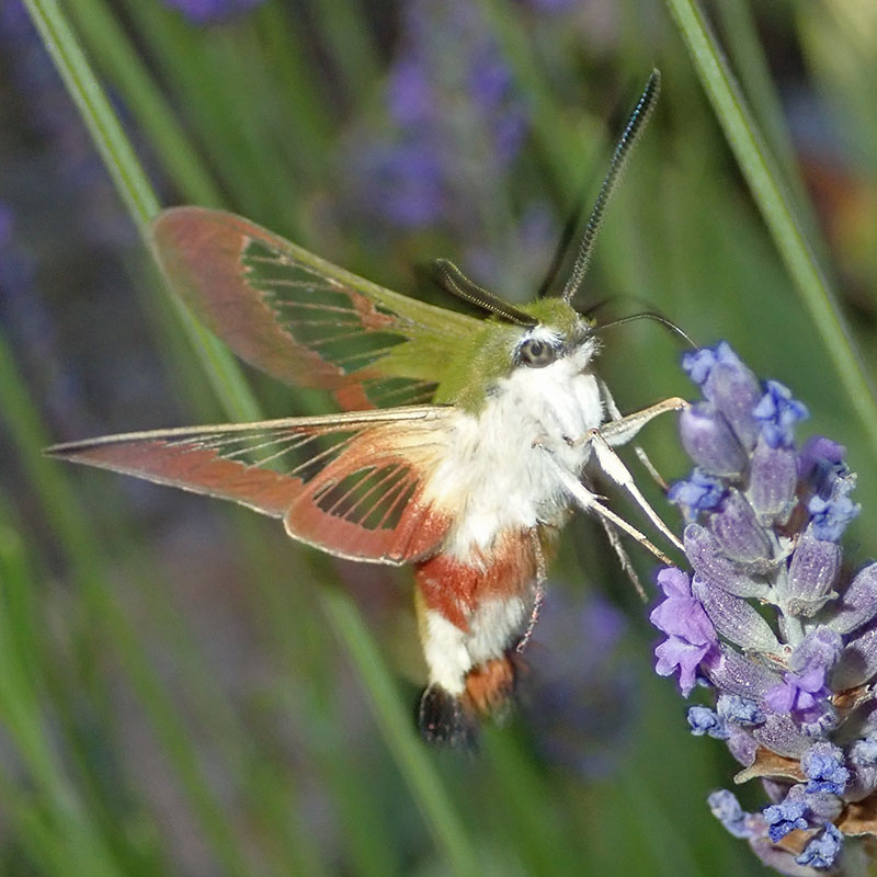 Le sphinx fuciforme est un des trois sphinx diurne et qui pratique le vol stationnaire pour butiner avec sa longue trompe les fleurs à corolles profondes et inacessibles aux autres insectes. Le plus souvent, il pose quand même ses pattes avant sur la corolle pour se stabiliser alors que le moro-sphinx, lui, est le seul qui aspire le nectar «sans les pattes». Ses ailes sont transparentes avec une large bordure rouge brique. Le dessus du thorax est jaune verdâtre, le dessous bien blanc. L'abdomen est décoré d'un anneau orange complet, le restant est jaune verdâtre sur le dessus et blanc en dessous. Il est, comme tous les sphinx, très rapide et pompe le nectar à une vitesse surprenante : il est donc difficile à photographier ! Mieux vaut prévoir un coup de flash pour «fixer» les ailes. La femelle, en vol stationnaire, courbe l'abdomen au niveau d'une feuille de la plante hôte et pont un oeuf sur la face inférieure. Les chenilles se trouvent généralement sur des buissons au moins partiellement ensoleillés et bas. Elles sont entièrement vertes et grossissent en quatre mues sans vraiment changer de morphologie (à part la taille) ni de couleur. Le papillon vole en une génération principalement d'avril à juin, avec souvent une deuxième génération partielle avec émergence vers août.