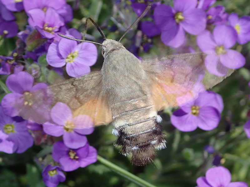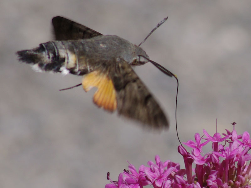 Le sphinx fuciforme a le même type de vol stationnaire que le moro-sphinx, mais ses ailes sont transparentes à part une bordure couleur brique. Il a aussi deux anneaux abdominaux de la même couleur. (voir la photo «comparaison des abdomens» plus bas)