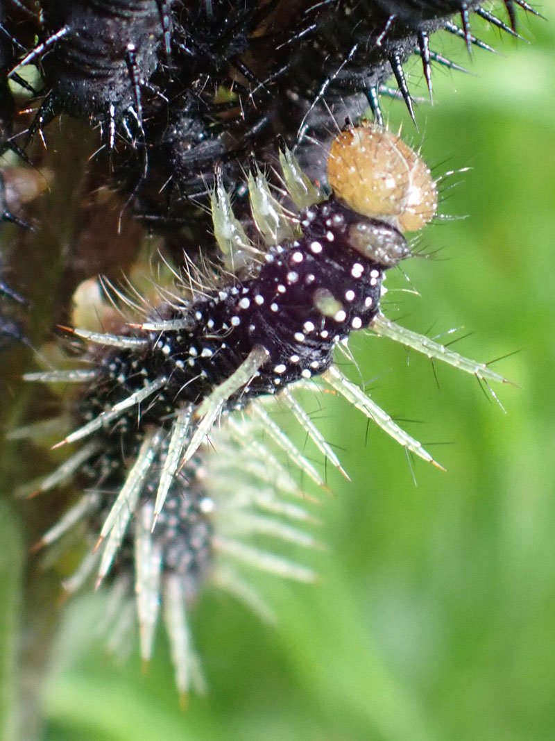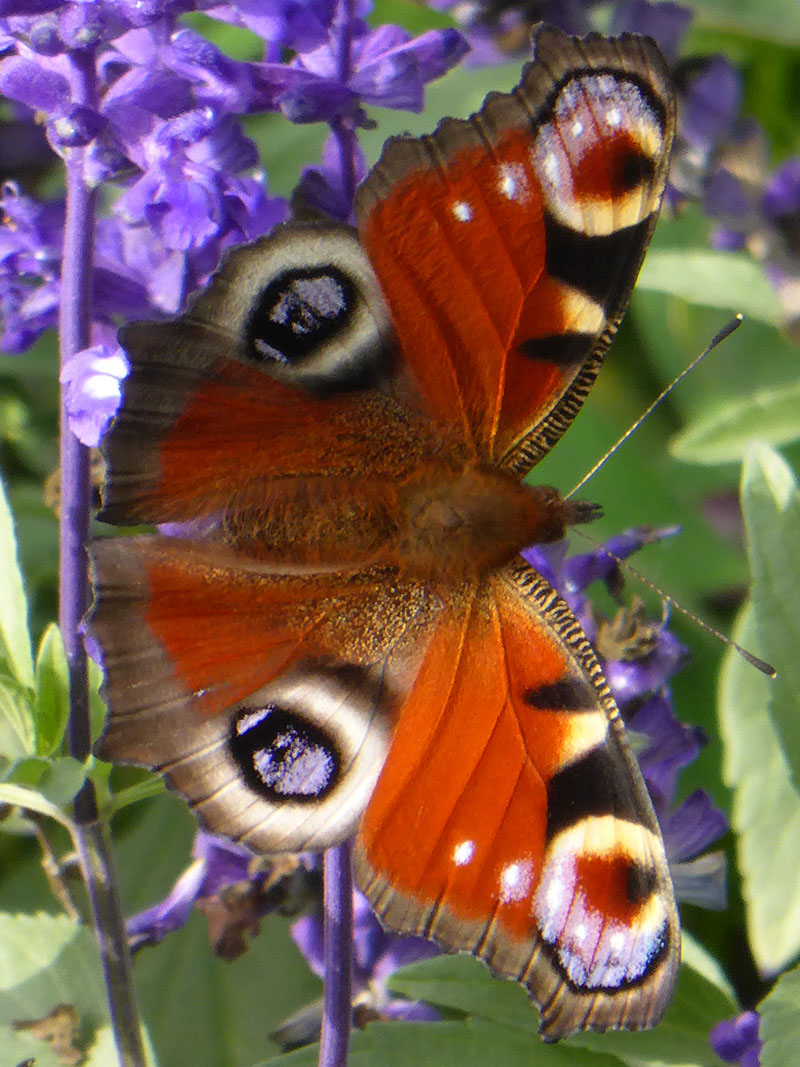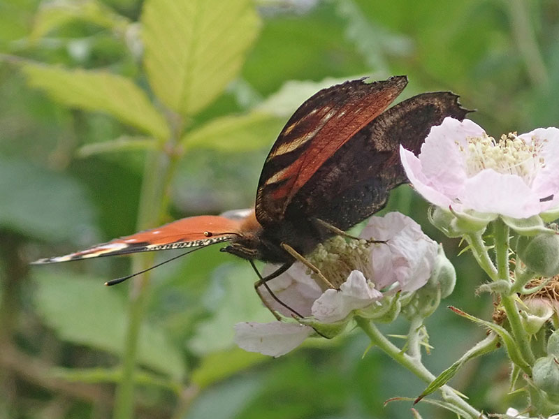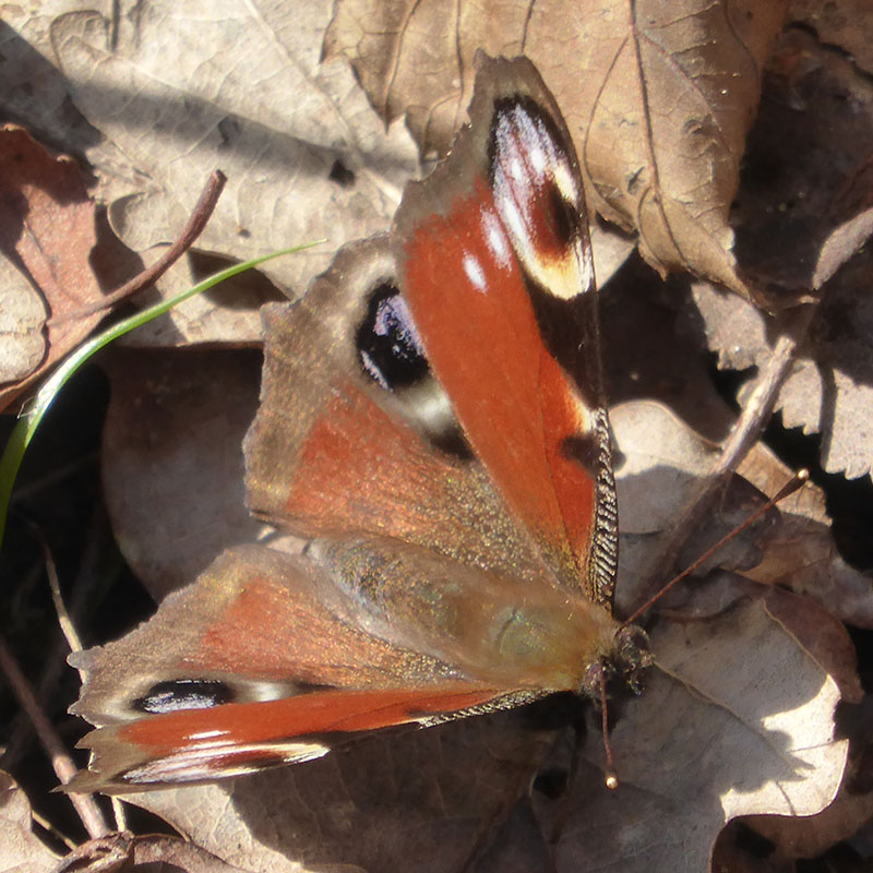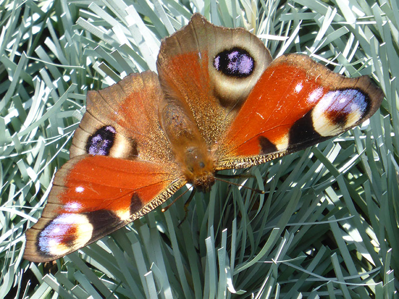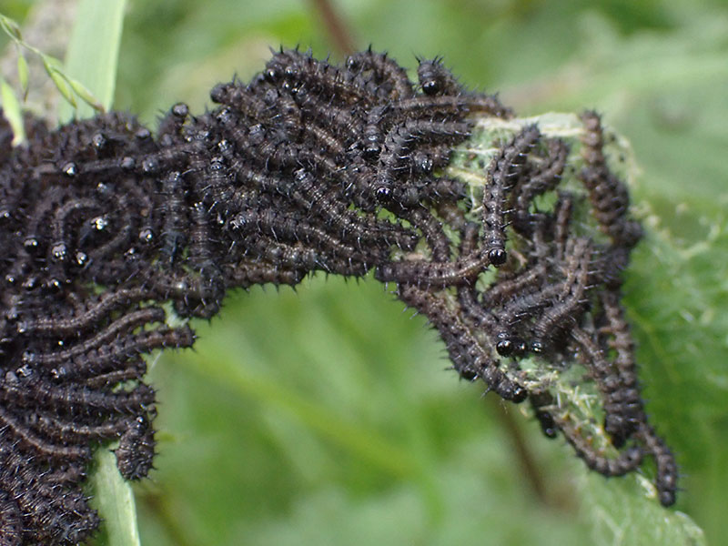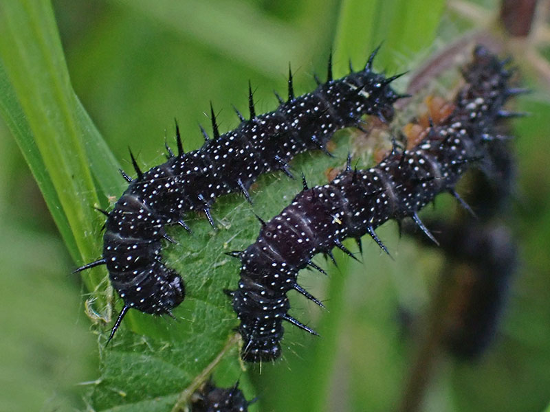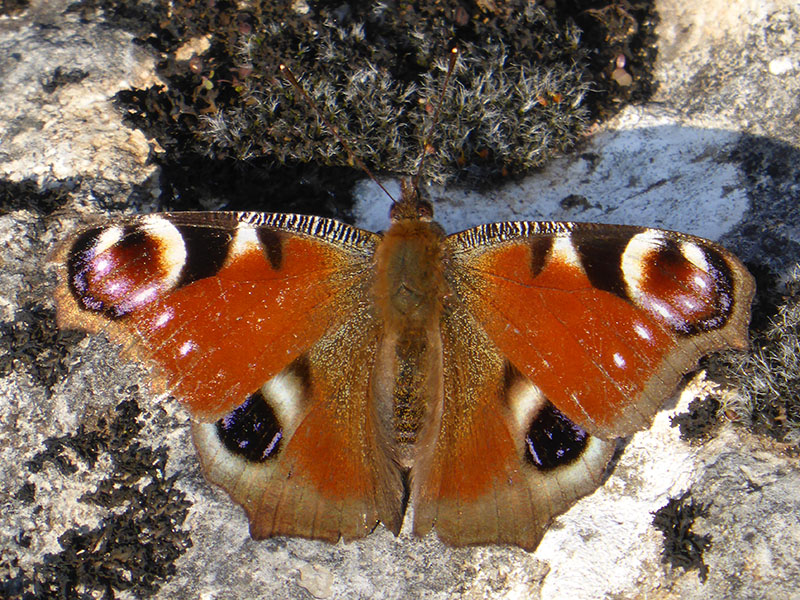 Le paon du jour est un papillon que l'on identifie du premier coup d'oeil : Sa couleur rouge-orangé et ses grand ocelles qui font penser à des plumes de paon sont uniques ! Le dessous des ailes antérieures est identique, le dessous des postérieures est entièrement brun sombre. Sa plante hôte est l'ortie, il n'est donc pas menacé de disparition du moins par manque de nourriture. On ne le rencontre cependant pas très souvent dans la région méditerranéenne car il prérère les milieux un peu humides. Il peut vivre jusqu'à sept mois, les spécimens de la deuxième et de la troisième génération hivernent et réapparaissent au printemps un peu plus tard que ceux de la petite tortue. Les chenilles sont grégaires jusqu'au dernier stage larvaire, elles se regroupent en haut d'une tige d'ortie et tissent une toile lâche de fils de soie. A maturité, la chenille est entièrement noire avec des épines noires, des petits points blancs et des fausses-pattes marron-clair. Elle s'écarte ensuite du groupe en parcourant plusieurs mètres pour se nymphoser.